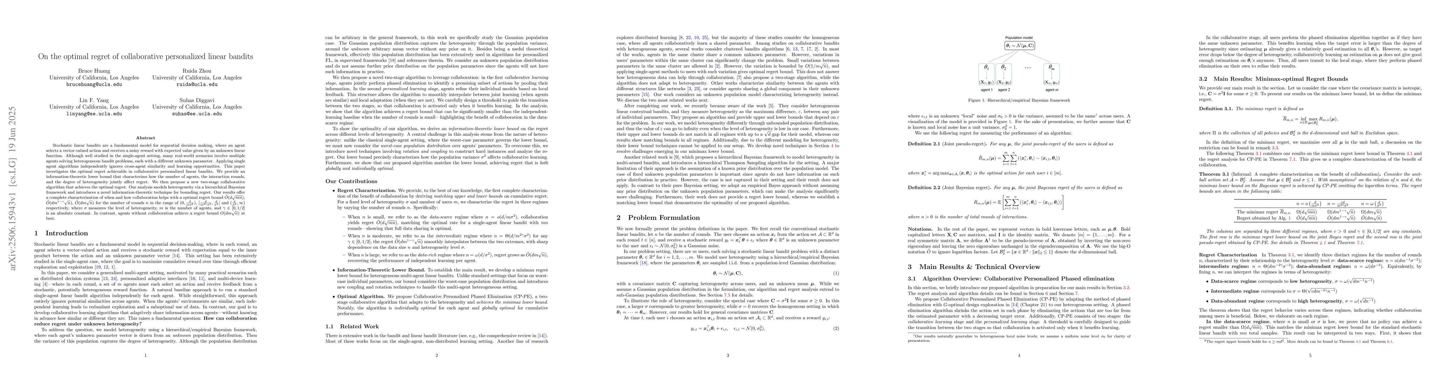 Stochastic linear bandits are a fundamental model for sequential decision making, where an agent selects a vector-valued action and receives a noisy reward with expected value given by an unknown linear function. Although well studied in the single-agent setting, many real-world scenarios involve multiple agents solving heterogeneous bandit problems, each with a different unknown parameter. Applying single agent algorithms independently ignores cross-agent similarity and learning opportunities. This paper investigates the optimal regret achievable in collaborative personalized linear bandits. We provide an information-theoretic lower bound that characterizes how the number of agents, the interaction rounds, and the degree of heterogeneity jointly affect regret. We then propose a new two-stage collaborative algorithm that achieves the optimal regret. Our analysis models heterogeneity via a hierarchical Bayesian framework and introduces a novel information-theoretic technique for bounding regret. Our results offer a complete characterization of when and how collaboration helps with a optimal regret bound $\tilde{O}(d\sqrt{mn})$, $\tilde{O}(dm^{1-\gamma}\sqrt{n})$, $\tilde{O}(dm\sqrt{n})$ for the number of rounds $n$ in the range of $(0, \frac{d}{m \sigma^2})$, $[\frac{d}{m^{2\gamma} \sigma^2}, \frac{d}{\sigma^2}]$ and $(\frac{d}{\sigma^2}, \infty)$ respectively, where $\sigma$ measures the level of heterogeneity, $m$ is the number of agents, and $\gamma\in[0, 1/2]$ is an absolute constant. In contrast, agents without collaboration achieve a regret bound $O(dm\sqrt{n})$ at best.
