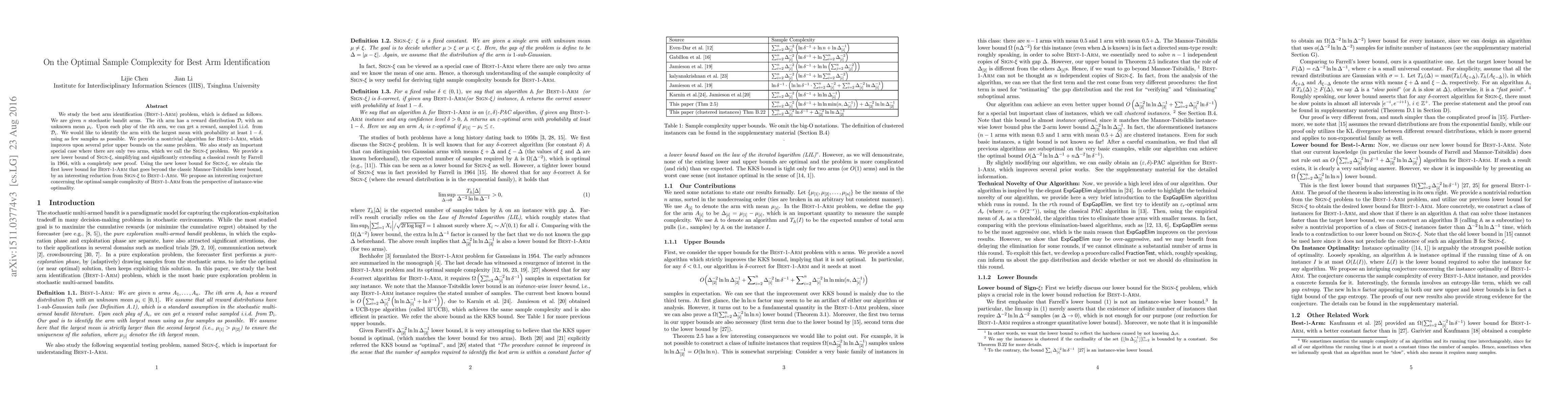 We study the best arm identification (BEST-1-ARM) problem, which is defined as follows. We are given $n$ stochastic bandit arms. The $i$th arm has a reward distribution $D_i$ with an unknown mean $\mu_{i}$. Upon each play of the $i$th arm, we can get a reward, sampled i.i.d. from $D_i$. We would like to identify the arm with the largest mean with probability at least $1-\delta$, using as few samples as possible. We provide a nontrivial algorithm for BEST-1-ARM, which improves upon several prior upper bounds on the same problem. We also study an important special case where there are only two arms, which we call the sign problem. We provide a new lower bound of sign, simplifying and significantly extending a classical result by Farrell in 1964, with a completely new proof. Using the new lower bound for sign, we obtain the first lower bound for BEST-1-ARM that goes beyond the classic Mannor-Tsitsiklis lower bound, by an interesting reduction from Sign to BEST-1-ARM. We propose an interesting conjecture concerning the optimal sample complexity of BEST-1-ARM from the perspective of instance-wise optimality.