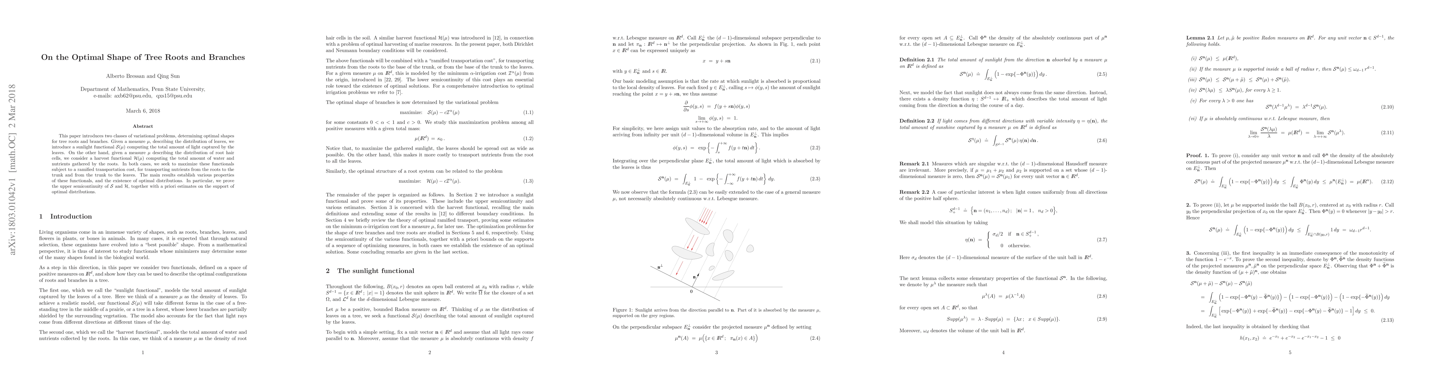 Researchers optimize tree root and branch shapes to maximize sunlight capture and nutrient gathering while minimizing transportation costs. They prove the existence of optimal distributions and establish properties of these functions.