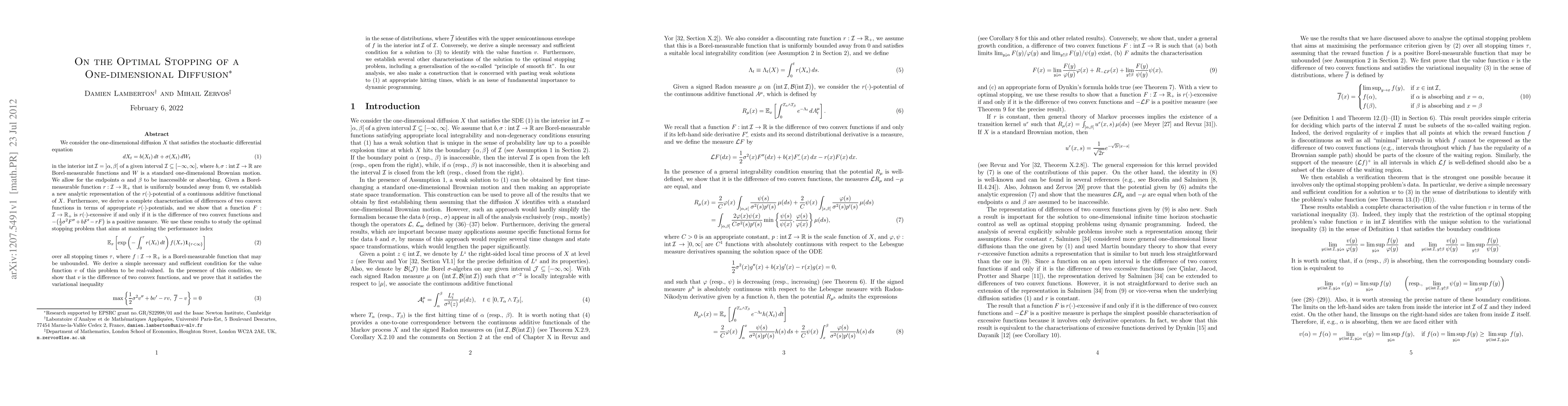 We consider a one-dimensional diffusion which solves a stochastic differential equation with Borel-measurable coefficients in an open interval. We allow for the endpoints to be inaccessible or absorbing. Given a Borel-measurable function $r$ that is uniformly bounded away from 0, we establish a new analytic representation of the $r$-potential of a continuous additive functional of the diffusion. We also characterize the value function of an optimal stopping problem with general reward function as the unique solution of a variational inequality (in the sense of distributions) with appropriate growth or boundary conditions. Furthermore, we establish several other characterisations of the solution to the optimal stopping problem, including a generalisation of the so-called "principle of smooth fit".