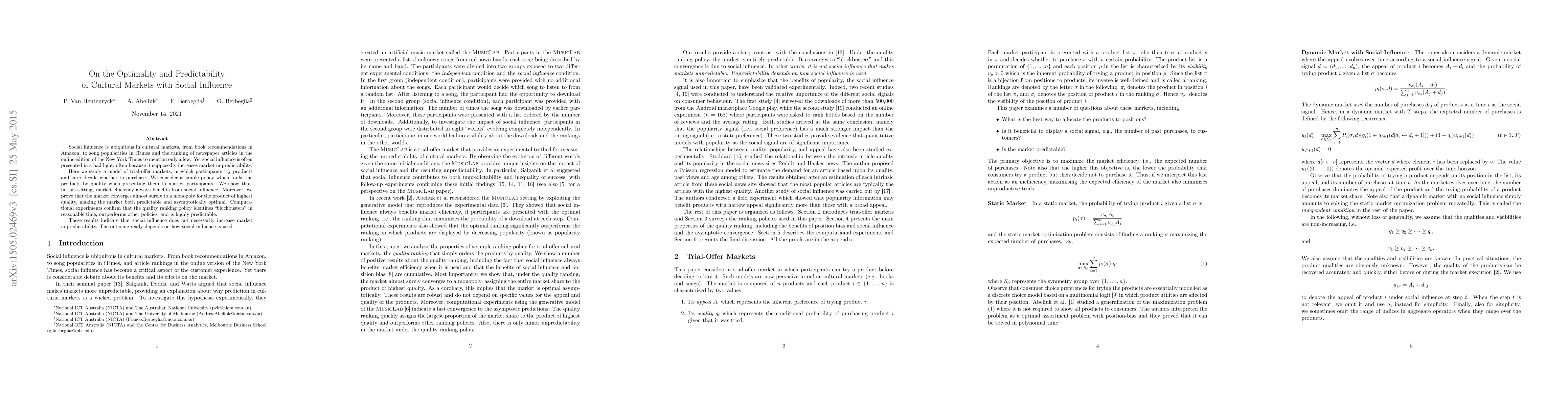 This paper explores the impact of social influence in cultural markets, demonstrating that when products are ranked by quality, social influence can lead to market efficiency, predictability, and optimal outcomes. The study shows that markets converge to a monopoly for the highest quality product, refuting the notion that social influence inherently increases unpredictability.