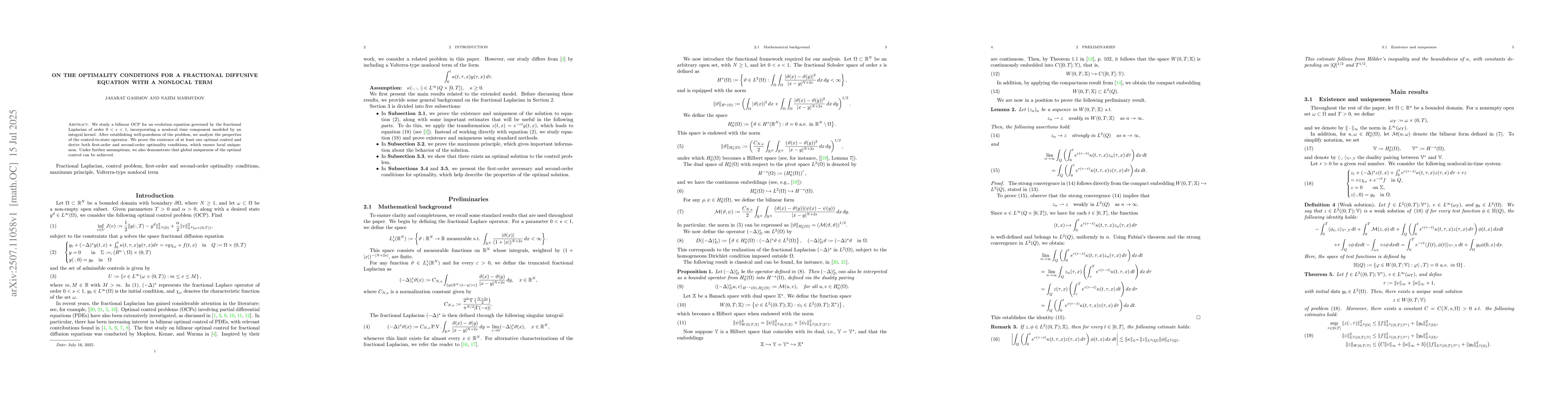 We study a bilinear OCP for an evolution equation governed by the fractional Laplacian of order $0 < s < 1$, incorporating a nonlocal time component modeled by an integral kernel. After establishing well-posedness of the problem, we analyze the properties of the control-to-state operator. We prove the existence of at least one optimal control and derive both first-order and second-order optimality conditions, which ensure local uniqueness. Under further assumptions, we also demonstrate that global uniqueness of the optimal control can be achieved.