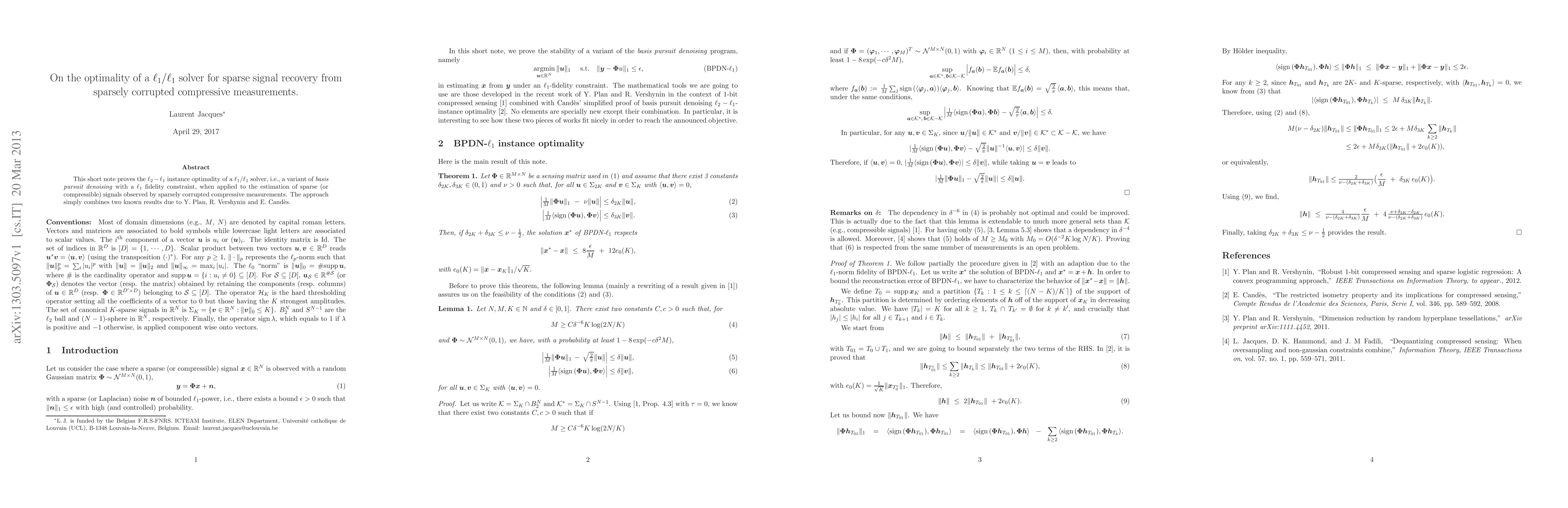 This paper demonstrates the optimality of an $\ell_1/\ell_1$ solver for sparse signal recovery from sparsely corrupted compressive measurements, combining results from Plan, Vershynin, and Candès to prove its $\ell_2-\ell_1$ instance optimality.