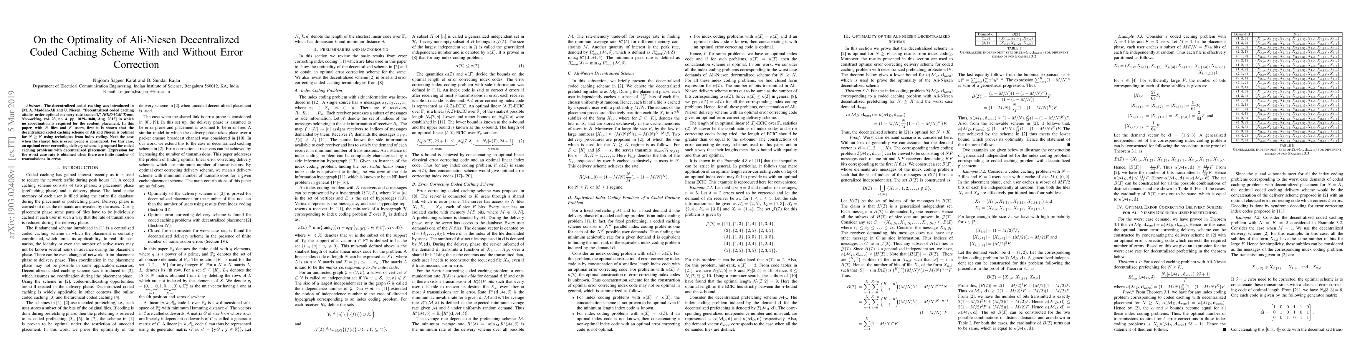 This paper demonstrates the optimality of the Ali-Niesen decentralized coded caching scheme for $N \geq K$ users using index coding techniques. It further proposes an optimal error correction method for scenarios where the shared link is error-prone, providing an expression for the worst-case rate under finite error transmissions.