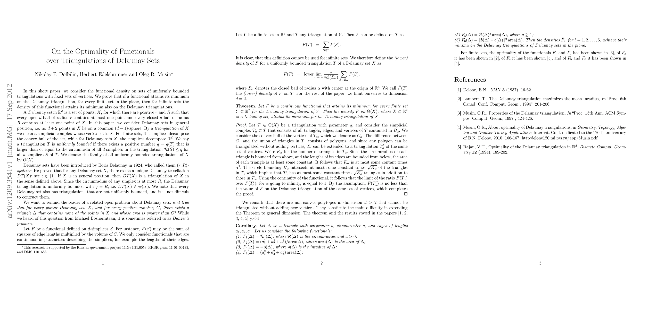 In this short paper, we consider the functional density on sets of uniformly bounded triangulations with fixed sets of vertices. We prove that if a functional attains its minimum on the Delaunay triangulation, for every finite set in the plane, then for infinite sets the density of this functional attains its minimum also on the Delaunay triangulations.