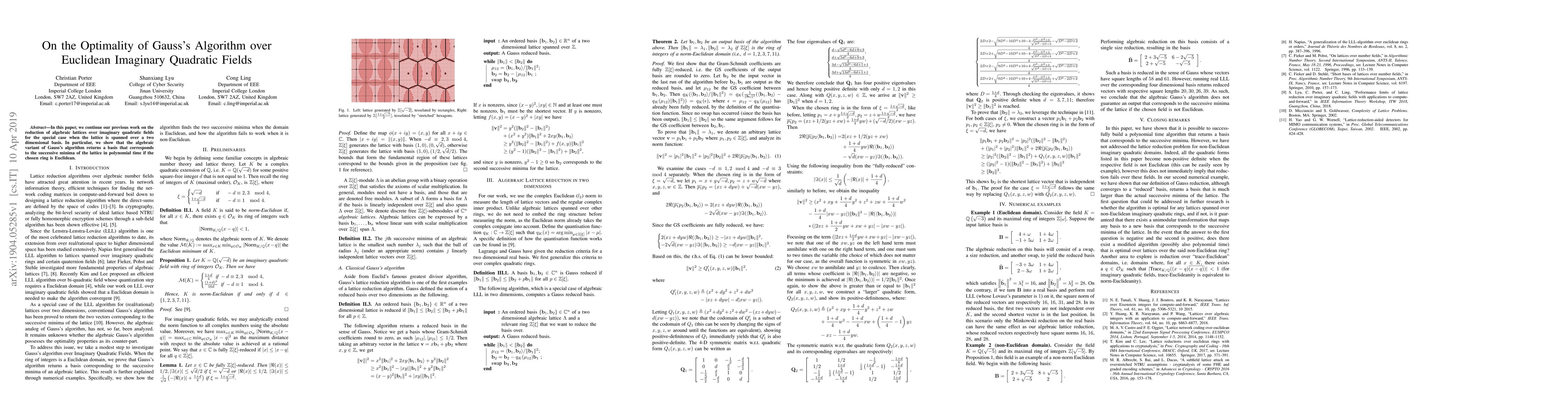 This paper demonstrates that Gauss's algorithm optimally reduces algebraic lattices over Euclidean imaginary quadratic fields, providing a basis corresponding to the lattice's successive minima in polynomial time. This builds on prior work focusing on two-dimensional basis lattices.
