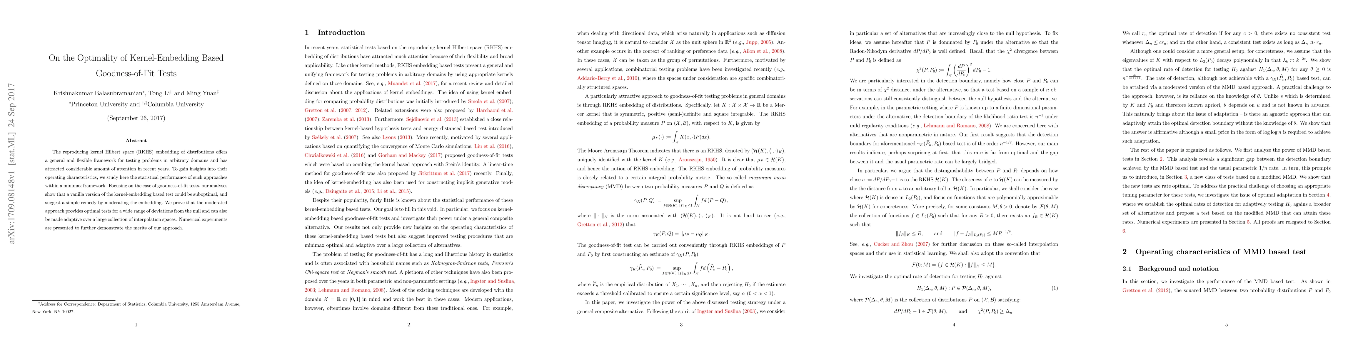 This paper investigates the statistical performance of kernel-embedding based goodness-of-fit tests within a minimax framework, finding that a vanilla kernel-embedding test is suboptimal. It proposes a moderated embedding approach that provides optimal tests for various deviations from the null hypothesis and can be adapted across multiple interpolation spaces.