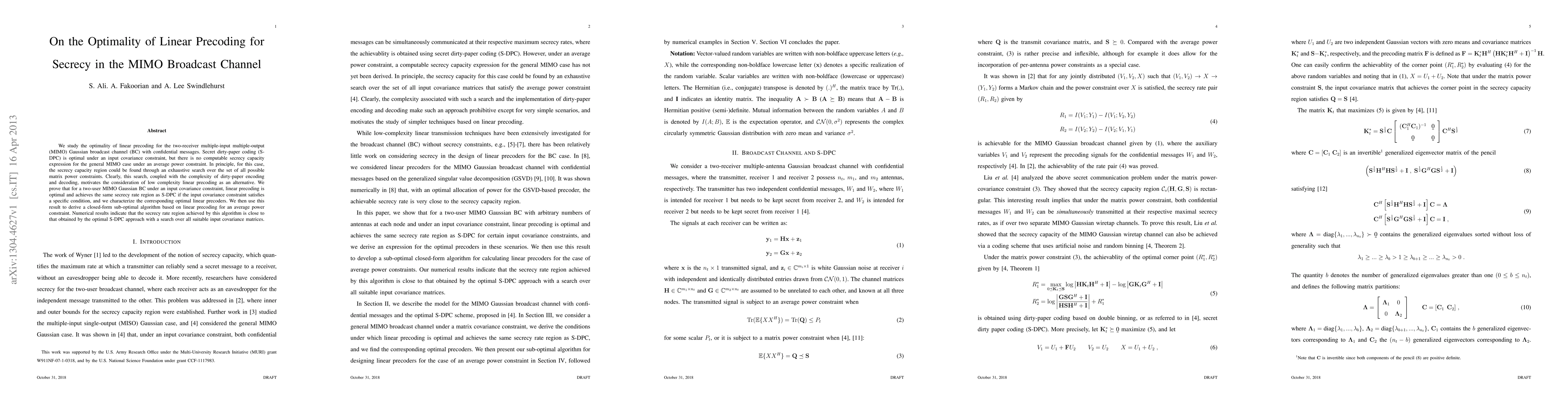 This paper proves that linear precoding is optimal for a two-receiver MIMO broadcast channel under an input covariance constraint, achieving the same secrecy rate as secret dirty-paper coding. It also proposes a closed-form sub-optimal algorithm based on linear precoding for average power constraints, which closely approximates the optimal secrecy rate.