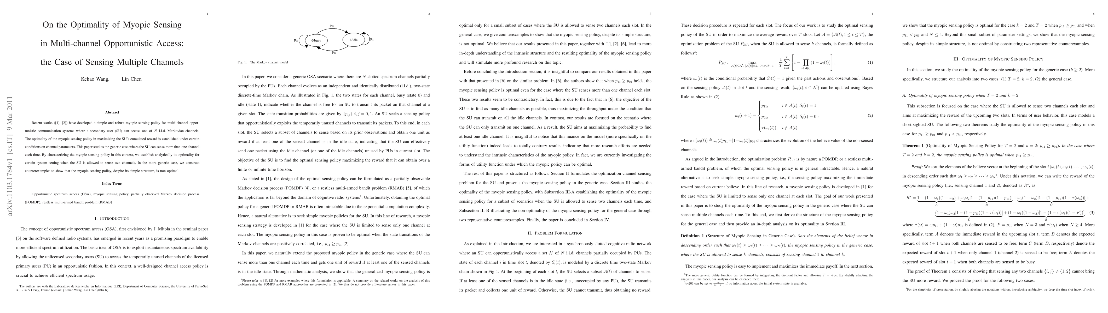 This paper investigates the optimality of a myopic sensing policy in multi-channel opportunistic access systems where a secondary user can sense multiple channels simultaneously. It establishes the policy's optimality when the SU senses two channels but provides counterexamples showing non-optimality in more generic scenarios.
