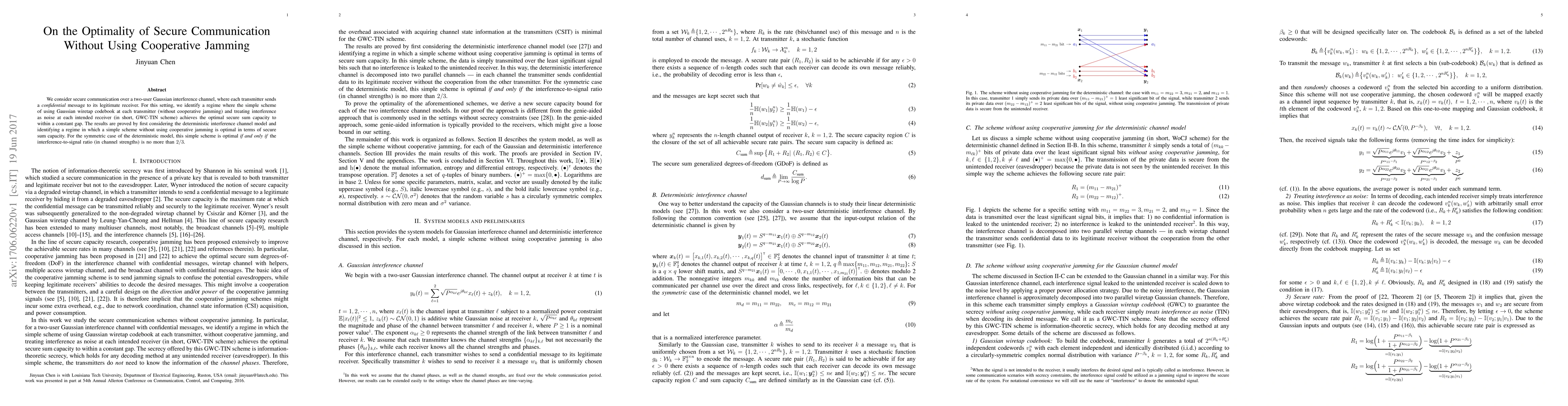 Researchers found a simple scheme for secure communication over a Gaussian interference channel that achieves optimal capacity without cooperative jamming, under certain conditions, particularly when the interference-to-signal ratio is no more than 2/3.