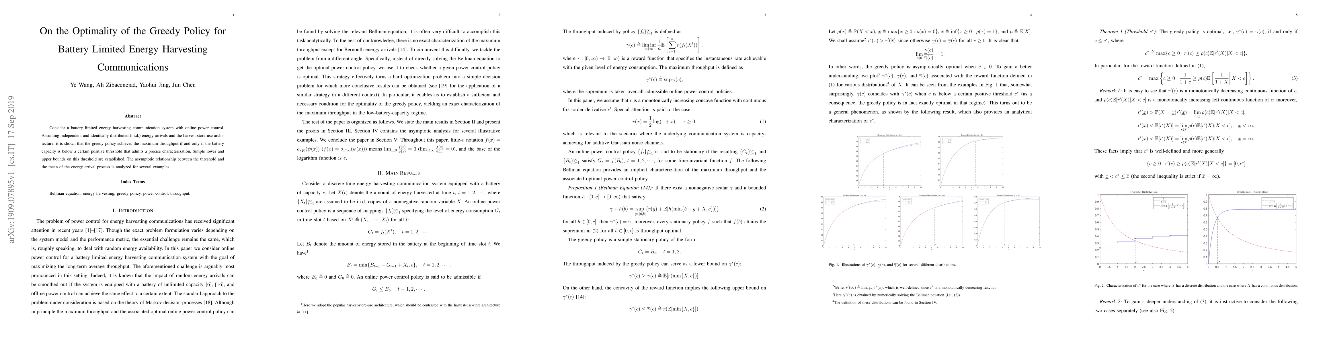 Consider a battery limited energy harvesting communication system with online power control. Assuming independent and identically distributed (i.i.d.) energy arrivals and the harvest-store-use architecture, it is shown that the greedy policy achieves the maximum throughput if and only if the battery capacity is below a certain positive threshold that admits a precise characterization. Simple lower and upper bounds on this threshold are established. The asymptotic relationship between the threshold and the mean of the energy arrival process is analyzed for several examples.