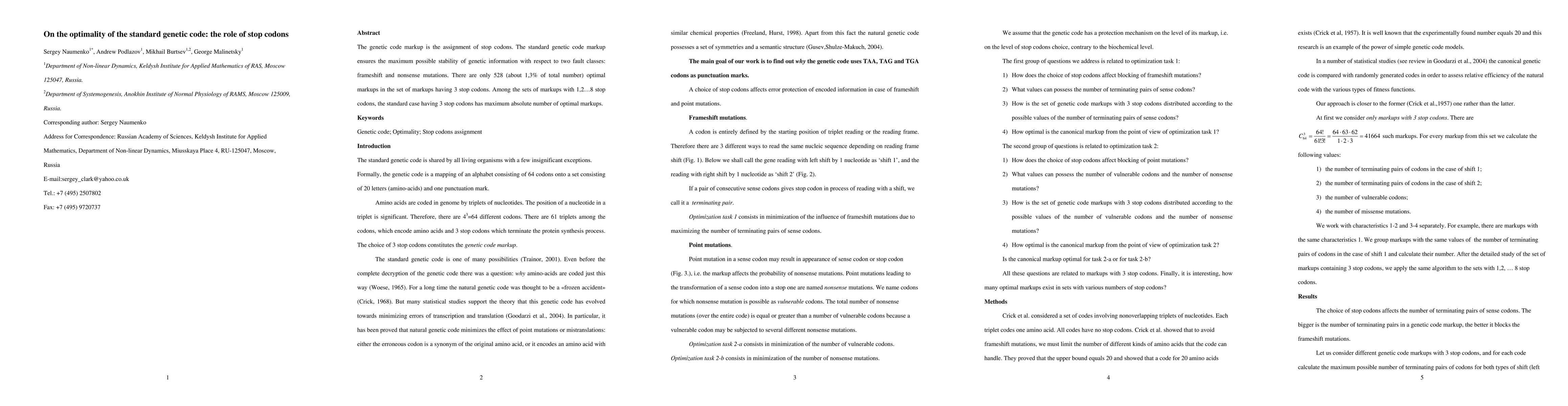 This paper investigates the optimality of the standard genetic code markup, focusing on the role of stop codons. It finds that the standard genetic code, with its three stop codons, has the maximum number of optimal configurations that maximize stability against frameshift and nonsense mutations among all possible genetic code markups.