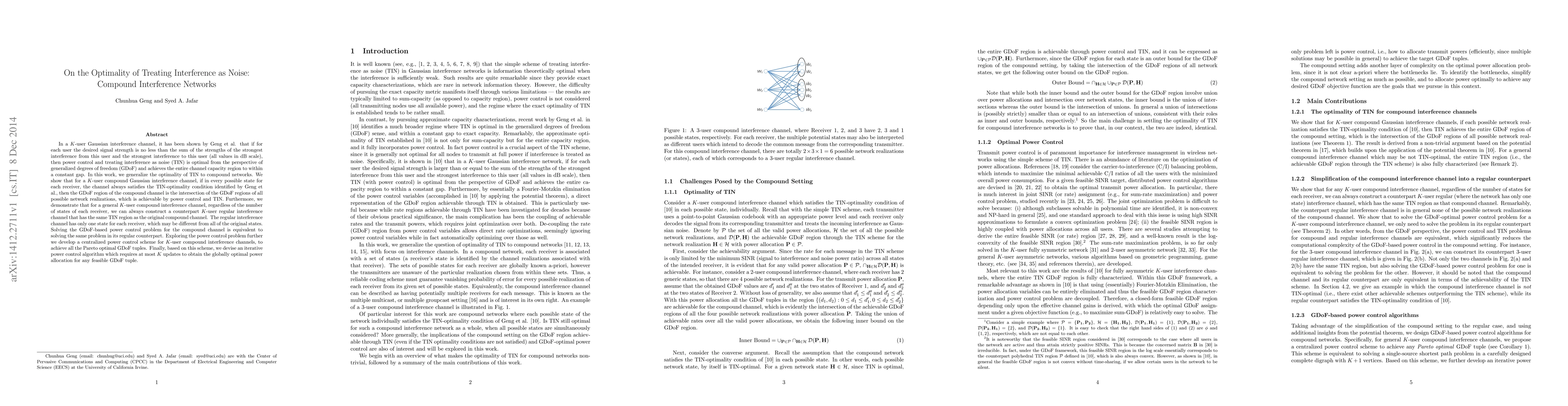 This paper explores the optimality of treating interference as noise (TIN) in K-user compound Gaussian interference channels, extending previous results from Geng et al. It shows that TIN achieves the entire channel capacity region if certain conditions are met, and develops a centralized power control scheme to achieve all Pareto optimal generalized degrees of freedom (GDoF) tuples, with an iterative algorithm requiring at most K updates for optimal power allocation.