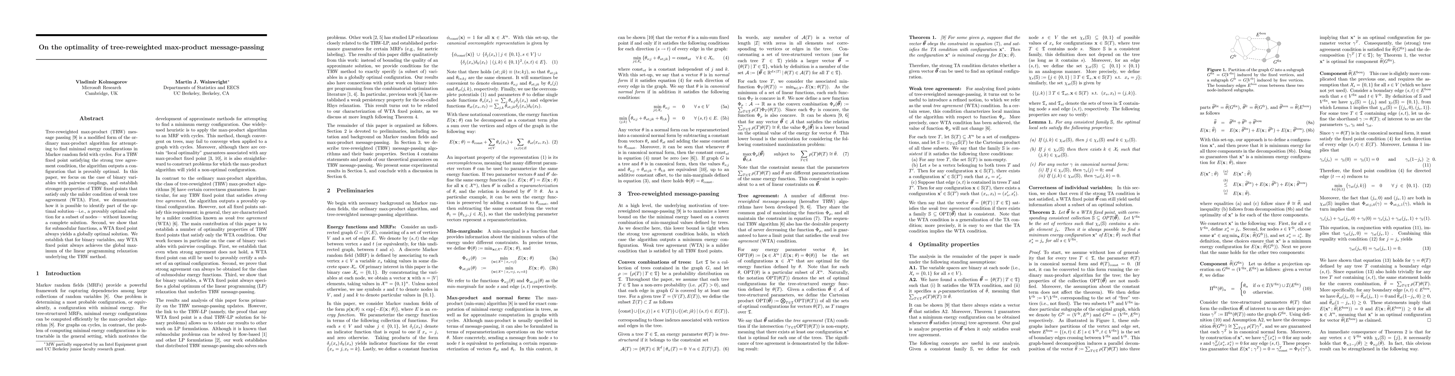 Tree-reweighted max-product (TRW) message passing is a modified form of the ordinary max-product algorithm for attempting to find minimal energy configurations in Markov random field with cycles. For a TRW fixed point satisfying the strong tree agreement condition, the algorithm outputs a configuration that is provably optimal. In this paper, we focus on the case of binary variables with pairwise couplings, and establish stronger properties of TRW fixed points that satisfy only the milder condition of weak tree agreement (WTA). First, we demonstrate how it is possible to identify part of the optimal solution|i.e., a provably optimal solution for a subset of nodes| without knowing a complete solution. Second, we show that for submodular functions, a WTA fixed point always yields a globally optimal solution. We establish that for binary variables, any WTA fixed point always achieves the global maximum of the linear programming relaxation underlying the TRW method.