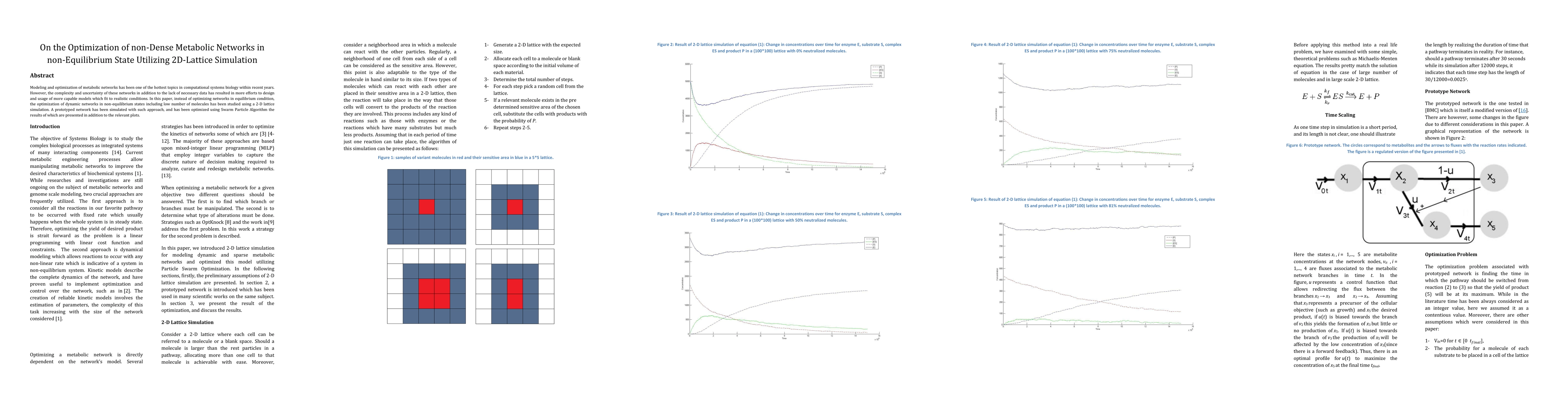 Modeling and optimization of metabolic networks has been one of the hottest topics in computational systems biology within recent years. However, the complexity and uncertainty of these networks in addition to the lack of necessary data has resulted in more efforts to design and usage of more capable models which fit to realistic conditions. In this paper, instead of optimizing networks in equilibrium condition, the optimization of dynamic networks in non-equilibrium states including low number of molecules has been studied using a 2-D lattice simulation. A prototyped network has been simulated with such approach, and has been optimized using Swarm Particle Algorithm the results of which are presented in addition to the relevant plots.