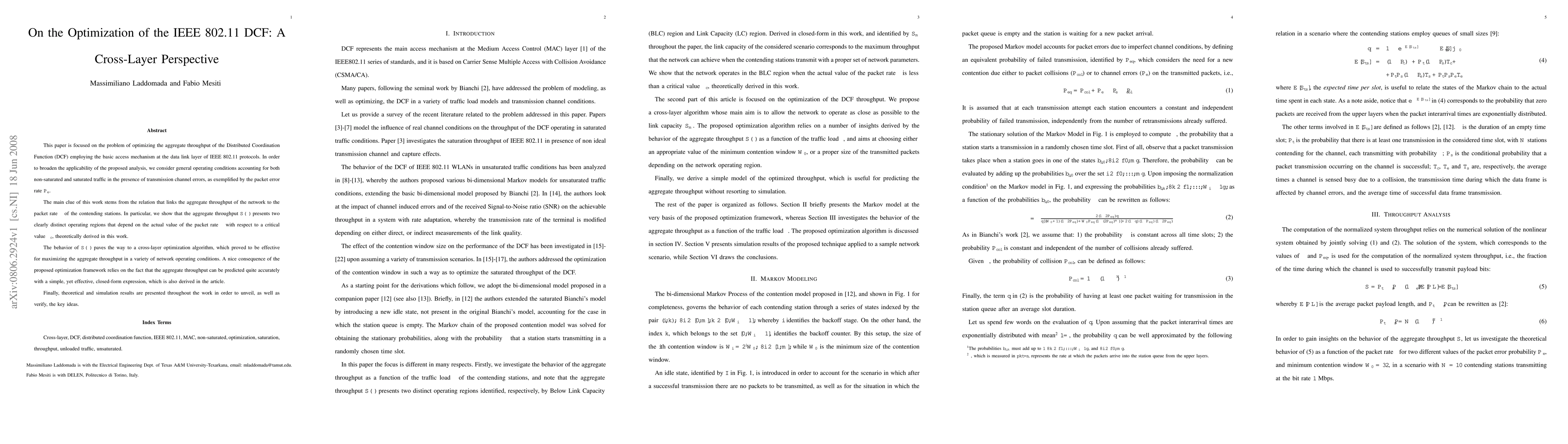 Researchers optimized the IEEE 802.11 DCF's aggregate throughput by analyzing its relation to packet rate and deriving a critical threshold, leading to an effective cross-layer optimization algorithm that maximizes network performance.