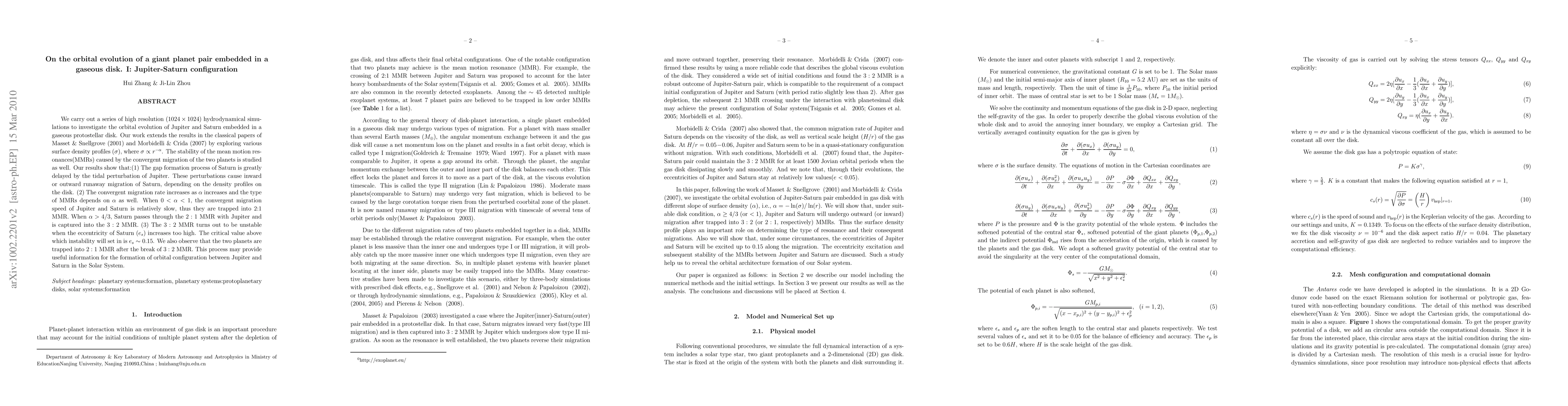 We carry out a series of high resolution ($1024\times 1024$) hydrodynamical simulations to investigate the orbital evolution of Jupiter and Saturn embedded in a gaseous protostellar disk. Our work extends the results in the classical papers of Masset & Snellgrove (2001) and Morbidelli & Crida (2007) by exploring various surface density profiles ($\sigma$), where $\sigma \propto r^{-\alpha}$. The stability of the mean motion resonances(MMRs) caused by the convergent migration of the two planets is studied as well. Our results show that:(1) The gap formation process of Saturn is greatly delayed by the tidal perturbation of Jupiter. These perturbations cause inward or outward runaway migration of Saturn, depending on the density profiles on the disk. (2) The convergent migration rate increases as $\alpha$ increases and the type of MMRs depends on $\alpha$ as well. When $0<\alpha<1$, the convergent migration speed of Jupiter and Saturn is relatively slow, thus they are trapped into 2:1 MMR. When $\alpha>4/3$, Saturn passes through the $2:1$ MMR with Jupiter and is captured into the $3:2$ MMR. (3) The $3:2$ MMR turns out to be unstable when the eccentricity of Saturn ($e_s$) increases too high. The critical value above which instability will set in is $e_s \sim 0.15$. We also observe that the two planets are trapped into $2:1$ MMR after the break of $3:2$ MMR. This process may provide useful information for the formation of orbital configuration between Jupiter and Saturn in the Solar System.