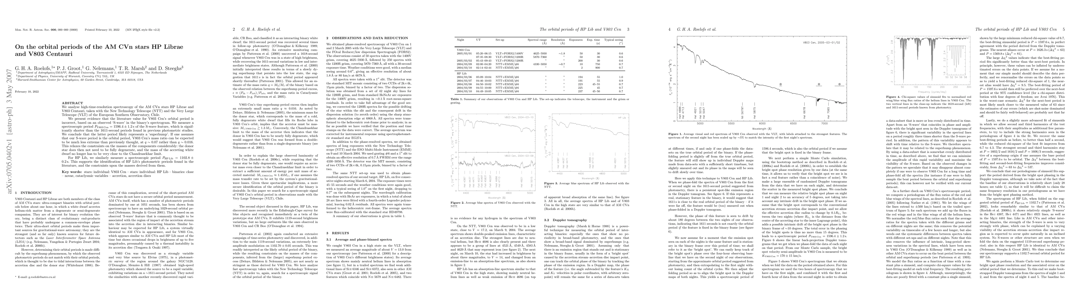 We analyse high-time-resolution spectroscopy of the AM CVn stars HP Librae and V803 Centauri, taken with the New Technology Telescope (NTT) and the Very Large Telescope (VLT) of the European Southern Observatory, Chile. We present evidence that the literature value for V803 Cen's orbital period is incorrect, based on an observed `S-wave' in the binary's spectrogram. We measure a spectroscopic period P=1596.4+/-1.2s of the S-wave feature, which is significantly shorter than the 1611-second periods found in previous photometric studies. We conclude that the latter period likely represents a `superhump'. If one assumes that our S-wave period is the orbital period, V803 Cen's mass ratio can be expected to be much less extreme than previously thought, at q~0.07 rather than q~0.016. This relaxes the constraints on the masses of the components considerably: the donor star does then not need to be fully degenerate, and the mass of the accreting white dwarf no longer has to be very close to the Chandrasekhar limit. For HP Lib, we similarly measure a spectroscopic period P=1102.8+/-0.2s. This supports the identification of HP Lib's photometric periods found in the literature, and the constraints upon the masses derived from them.