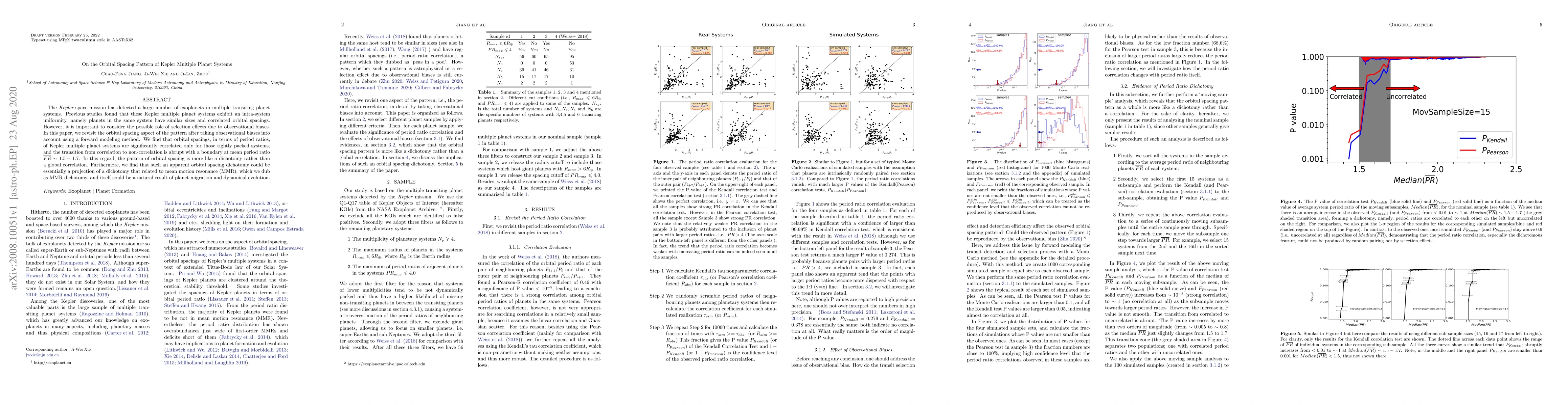 The Kepler space mission has detected a large number of exoplanets in multiple transiting planet systems. Previous studies found that these Kepler multiple planet systems exhibit an intra-system uniformity, namely planets in the same system have similar sizes and correlated orbital spacings. However, it is important to consider the possible role of selection effects due to observational biases. In this paper, we revisit the orbital spacing aspect of the pattern after taking observational biases into account using a forward modeling method. We find that orbital spacings, in terms of period ratios, of Kepler multiple planet systems are significantly correlated only for those tightly packed systems, and the transition from correlation to non-correlation is abrupt with a boundary at mean period ratio $\overline{PR}$ $\sim 1.5 - 1.7$. In this regard, the pattern of orbital spacing is more like a dichotomy rather than a global correlation. Furthermore, we find that such an apparent orbital spacing dichotomy could be essentially a projection of a dichotomy that related to mean motion resonance (MMR), which we dub as MMR dichotomy, and itself could be a natural result of planet migration and dynamical evolution.