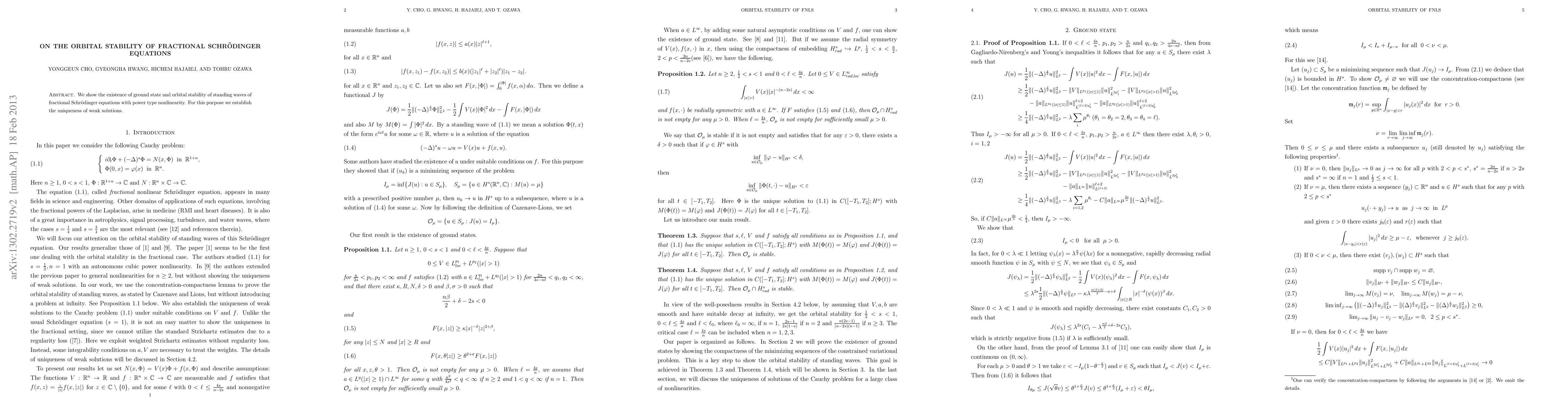 Summary: This paper demonstrates the existence and orbital stability of ground state standing waves for fractional Schrödinger equations with power nonlinearity, establishing the uniqueness of weak solutions in the process.