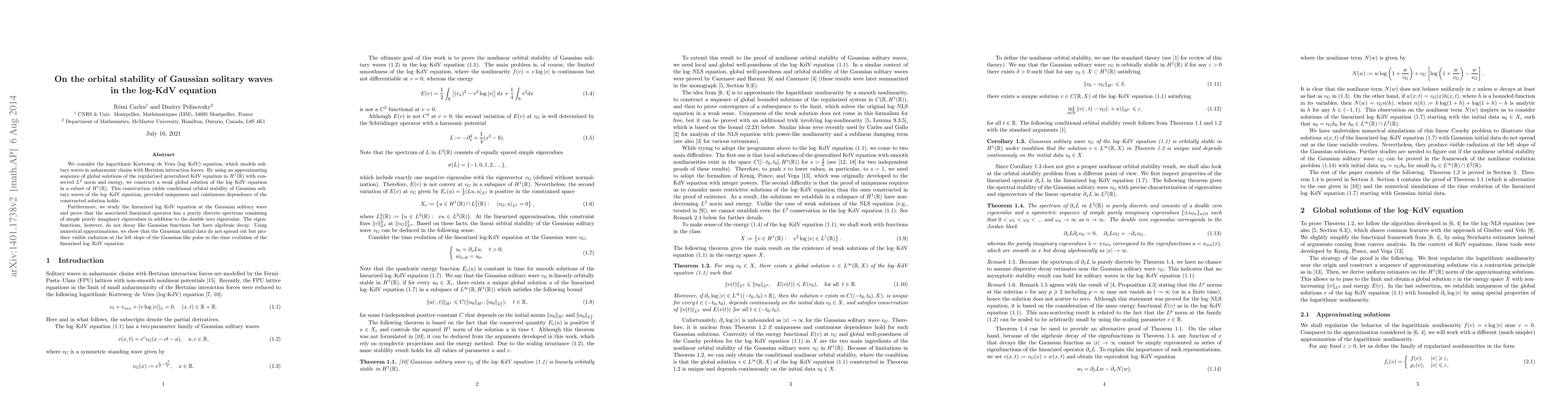The paper introduces a method to construct weak global solutions of the log-KdV equation and analyzes the spectrum of its linearized operator, demonstrating the conditional orbital stability of Gaussian solitary waves.