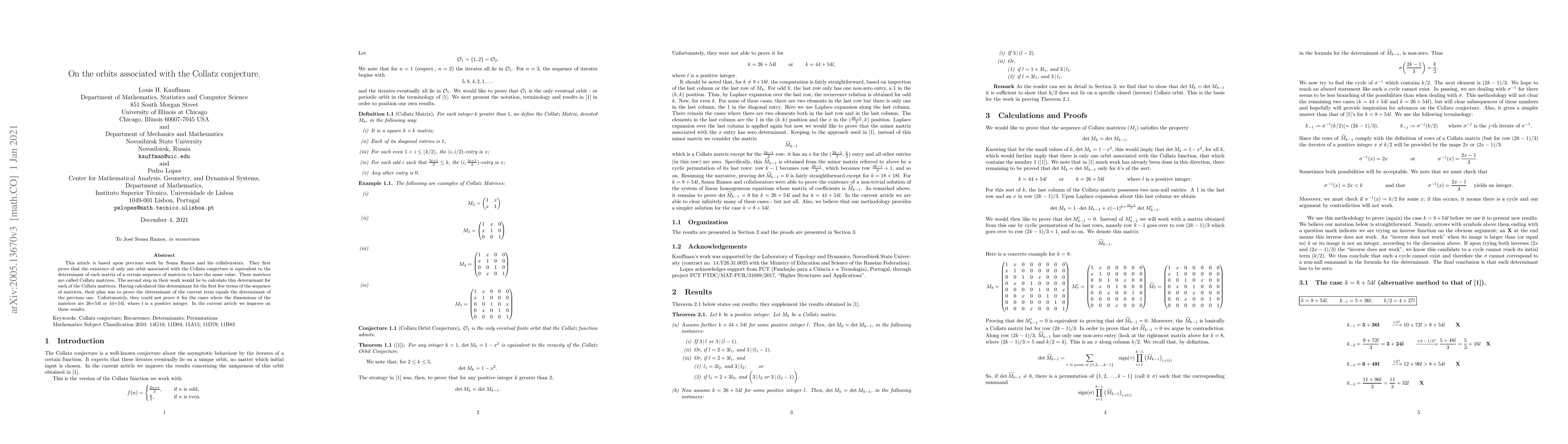 This article is based upon previous work by Sousa Ramos and his collaborators. They first prove that the existence of only one orbit associated with the Collatz conjecture is equivalent to the determinant of each matrix of a certain sequence of matrices to have the same value. These matrices are called Collatz matrices. The second step in their work would be to calculate this determinant for each of the Collatz matrices. Having calculated this determinant for the first few terms of the sequence of matrices, their plan was to prove the determinant of the current term equals the determinant of the previous one. Unfortunately, they could not prove it for the cases where the dimensions of the matrices are 26+54l or 44+54l, where l is a positive integer. In the current article we improve on these results.