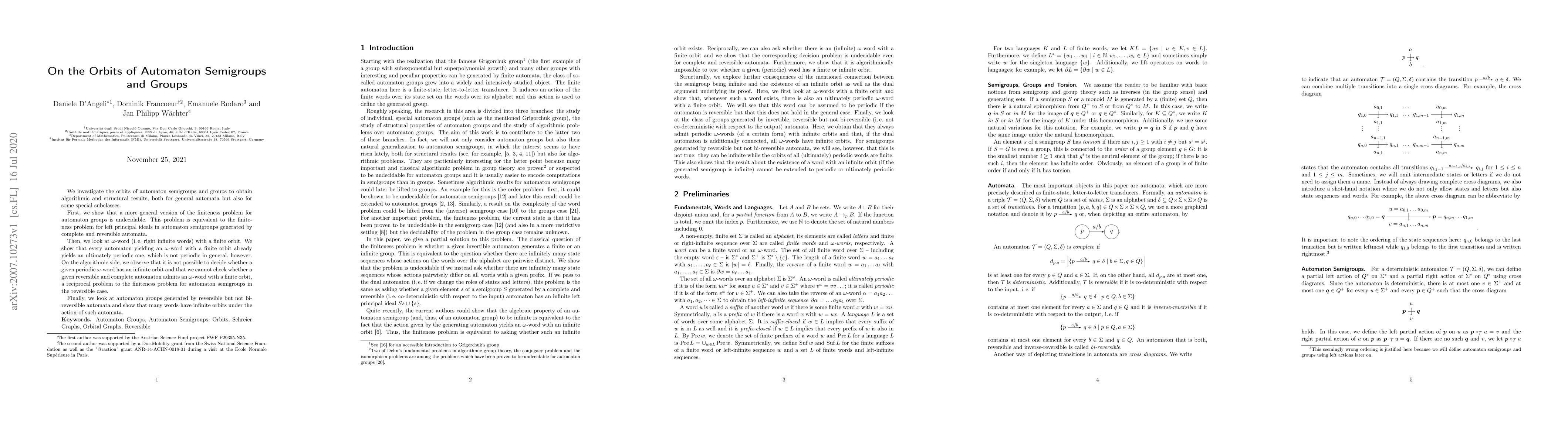 We investigate the orbits of automaton semigroups and groups to obtain algorithmic and structural results, both for general automata but also for some special subclasses. First, we show that a more general version of the finiteness problem for automaton groups is undecidable. This problem is equivalent to the finiteness problem for left principal ideals in automaton semigroups generated by complete and reversible automata. Then, we look at $\omega$-word (i.e. right infinite words) with a finite orbit. We show that every automaton yielding an $\omega$-word with a finite orbit already yields an ultimately periodic one, which is not periodic in general, however. On the algorithmic side, we observe that it is not possible to decide whether a given periodic $\omega$-word has an infinite orbit and that we cannot check whether a given reversible and complete automaton admits an $\omega$-word with a finite orbit, a reciprocal problem to the finiteness problem for automaton semigroups in the reversible case. Finally, we look at automaton groups generated by reversible but not bi-reversible automata and show that many words have infinite orbits under the action of such automata.