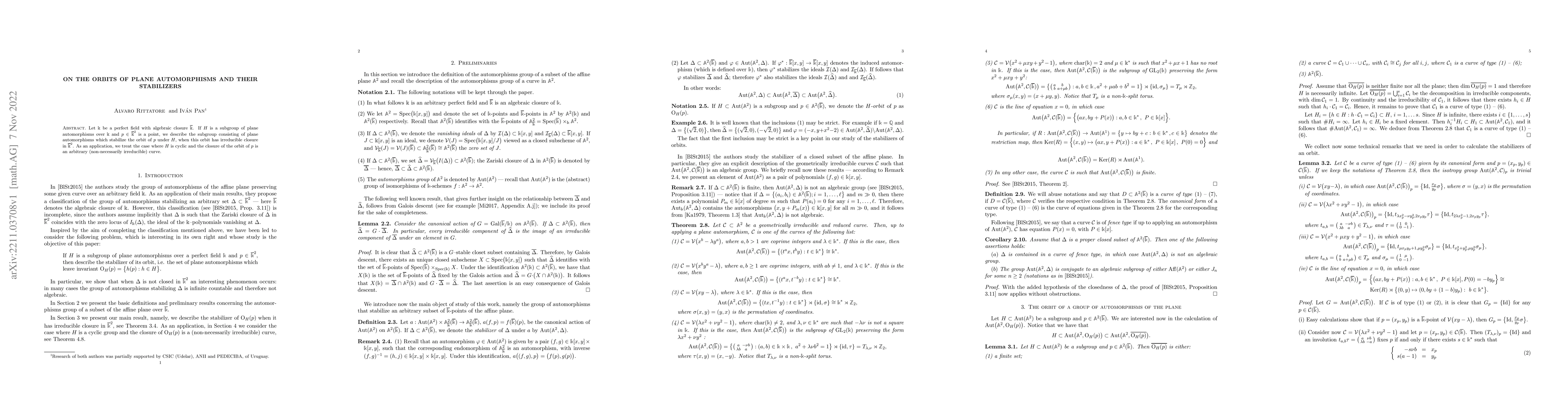 This paper investigates the stabilizers of orbits of plane automorphisms over a perfect field, focusing on cases where the orbit closure is irreducible. It also applies these findings to cyclic subgroups and non-necessarily irreducible orbit closures.