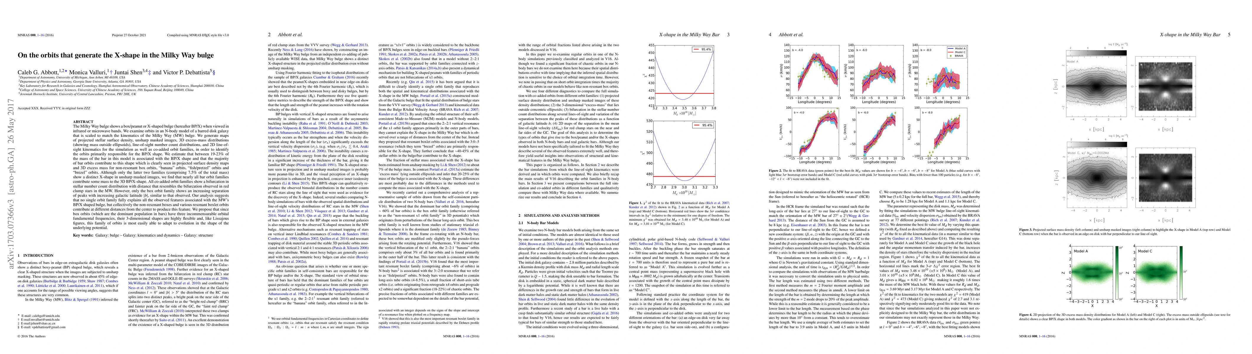 The Milky Way bulge shows a box/peanut or X-shaped bulge (hereafter BP/X) when viewed in infrared or microwave bands. We examine orbits in an N-body model of a barred disk galaxy that is scaled to match the kinematics of the Milky Way (MW) bulge. We generate maps of projected stellar surface density, unsharp masked images, 3D excess-mass distributions (showing mass outside ellipsoids), line-of-sight number count distributions, and 2D line-of-sight kinematics for the simulation as well as co-added orbit families, in order to identify the orbits primarily responsible for the BP/X shape. We estimate that between 19-23\% of the mass of the bar is associated with the BP/X shape and that most bar orbits contribute to this shape which is clearly seen in projected surface density maps and 3D excess mass for non-resonant box orbits, "banana" orbits, "fish/pretzel" orbits and "brezel" orbits. {We find that nearly all bar orbit families contribute some mass to the 3D BP/X-shape. All co-added orbit families show a bifurcation in stellar number count distribution with heliocentric distance that resembles the bifurcation observed in red clump stars in the MW. However, only the box orbit family shows an increasing separation of peaks with increasing galactic latitude $|b|$, similar to that observed.} Our analysis shows that no single orbit family fully explains all the observed features associated with the MW's BP/X shaped bulge, but collectively the non-resonant boxes and various resonant boxlet orbits contribute at different distances from the center to produce this feature. We propose that since box orbits have three incommensurable orbital fundamental frequencies, their 3-dimensional shapes are highly flexible and, like Lissajous figures, this family of orbits is most easily able to adapt to evolution in the shape of the underlying potential.