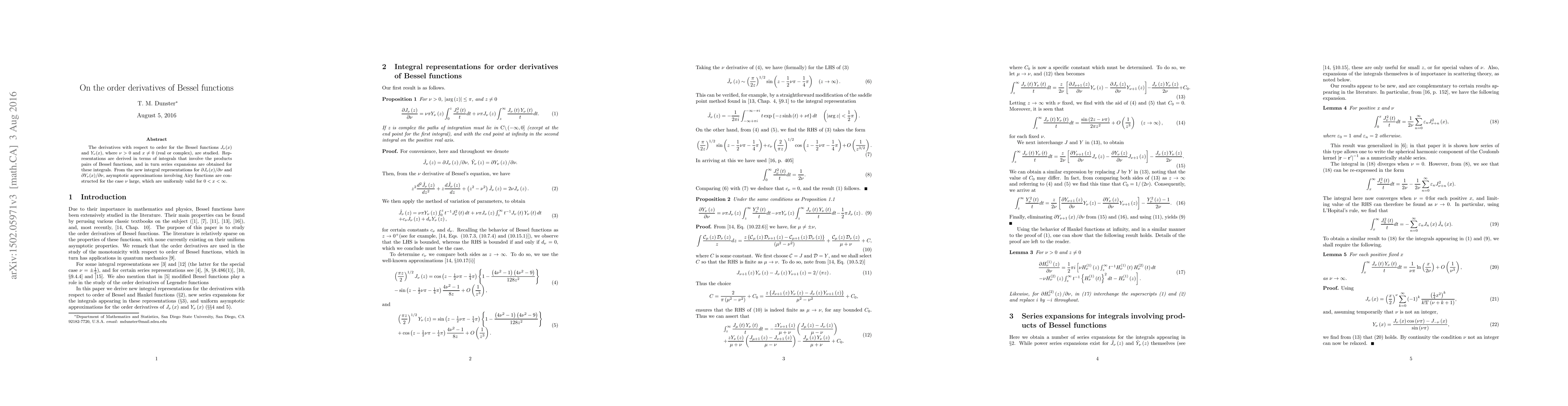 The paper studies derivatives with respect to order ν for Bessel functions of argument x (real or complex). It derives representations in terms of integrals involving products of Bessel functions and obtains series expansions for these integrals.