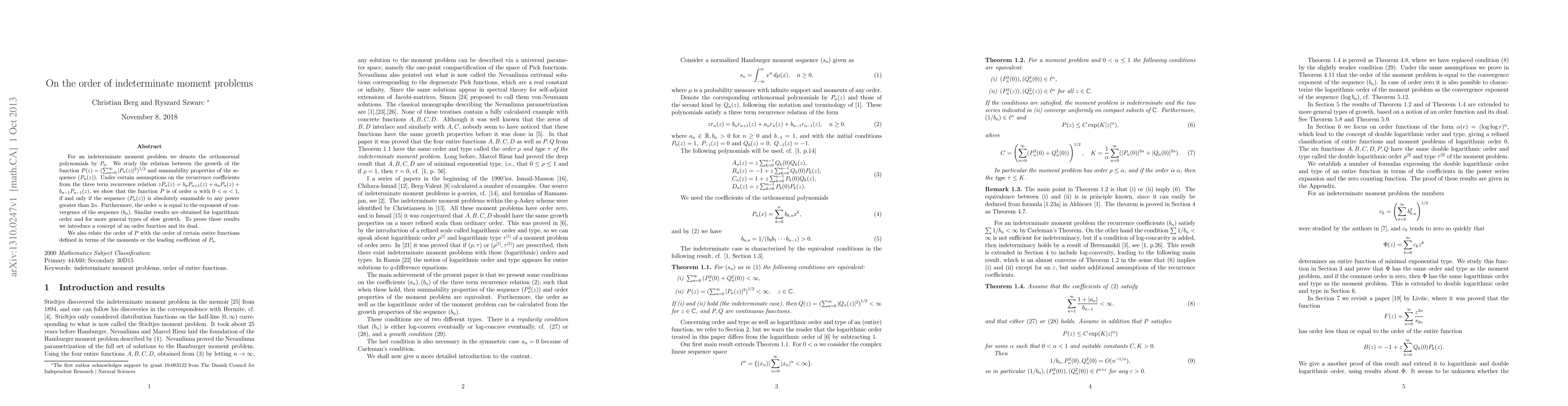 This paper investigates the relationship between the growth order of an indeterminate moment problem's orthonormal polynomials and the summability properties of the sequence of these polynomials. It establishes that the function P is of order α (0 < α < 1) if and only if the sequence is absolutely summable to any power greater than 2α, with α being the convergence exponent of the sequence of recurrence coefficients.