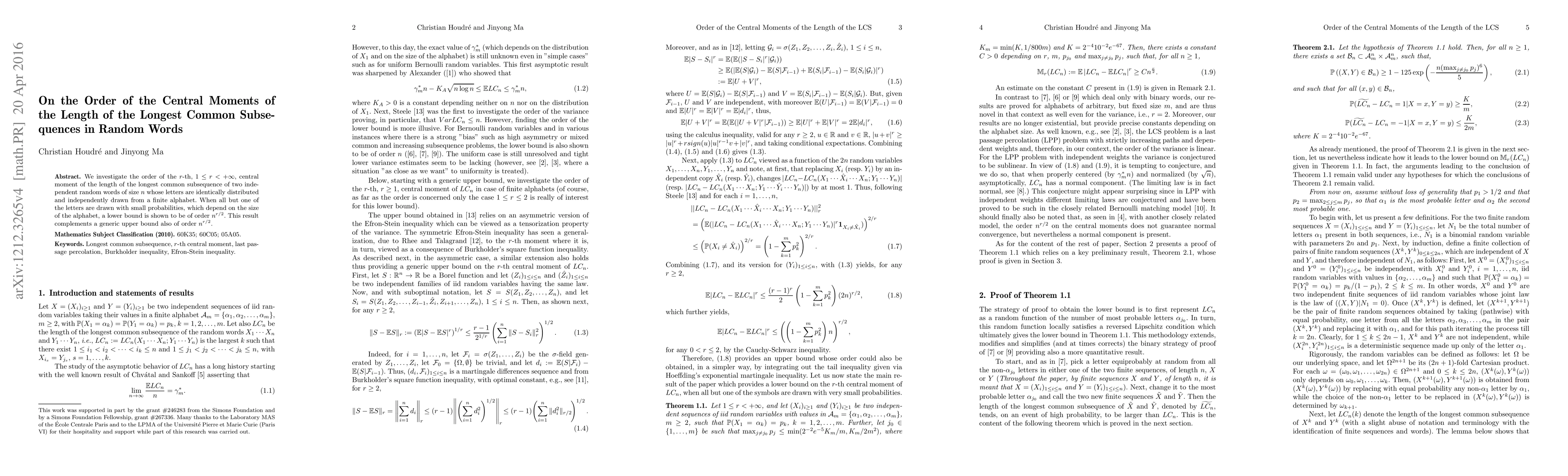 This paper examines the order of the $r$-th central moment for the length of the longest common subsequence in two independent random words from a finite alphabet, showing that under certain conditions, the lower bound is $n^{r/2}$. This complements an existing upper bound of the same order.