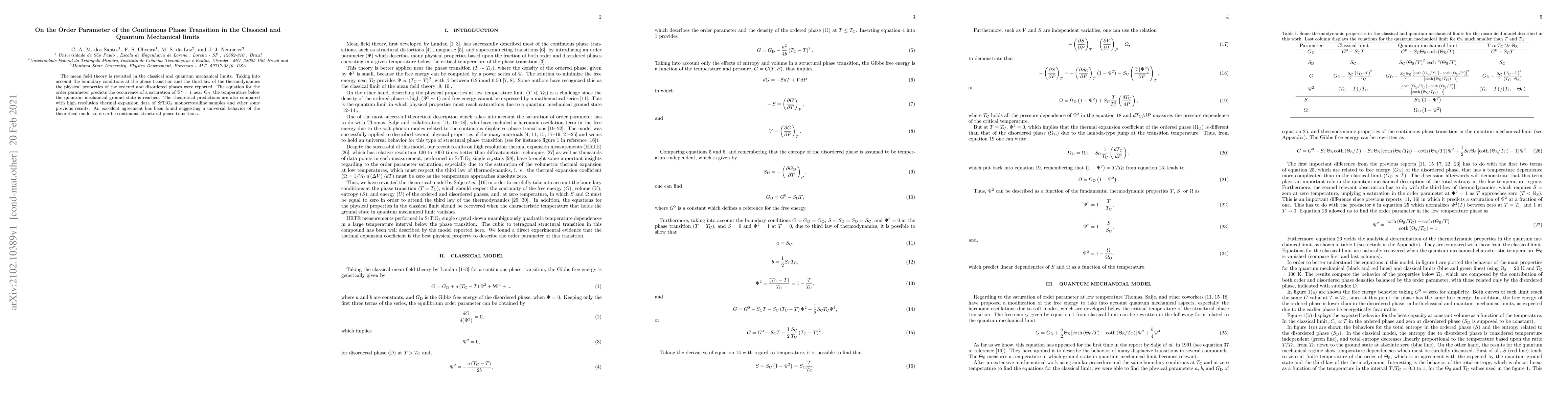 The mean field theory is revisited in the classical and quantum mechanical limits. Taking into account the boundary conditions at the phase transition and the third law of the thermodynamics the physical properties of the ordered and disordered phases were reported. The equation for the order parameter predicts the occurrence of a saturation of $\Psi^2$ = 1 near $\Theta_S$, the temperature below the quantum mechanical ground state is reached. The theoretical predictions are also compared with high resolution thermal expansion data of SrTiO$_{\text{3}}$ monocrystalline samples and other some previous results. An excellent agreement has been found suggesting a universal behavior of the theoretical model to describe continuous structural phase transitions.