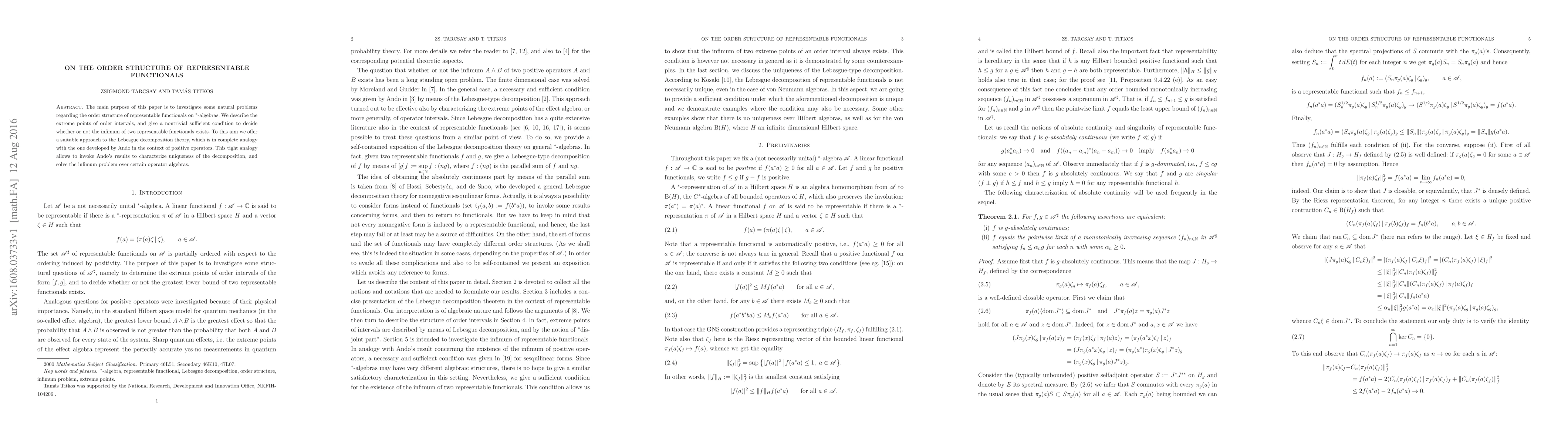 This paper investigates the order structure of representable functionals on *-algebras, focusing on extreme points of order intervals and conditions for infimum existence, with implications for Lebesgue decomposition theory.