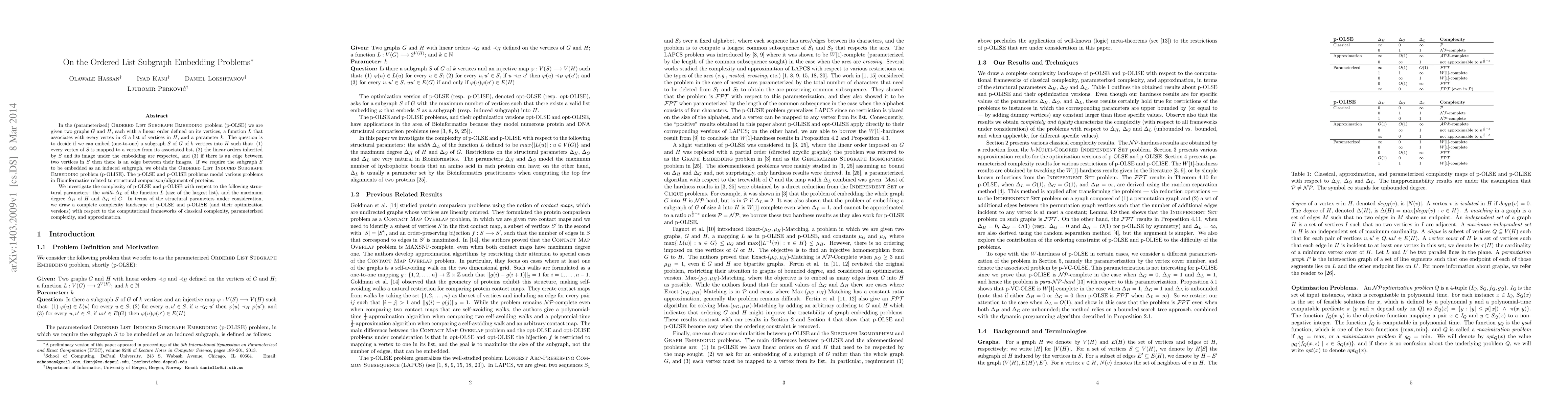 The paper investigates the complexity of two graph embedding problems, p-OLSE and p-OLISE, in terms of structural parameters like list width and maximum degree, providing a complete complexity landscape for classical, parameterized, and approximation frameworks.