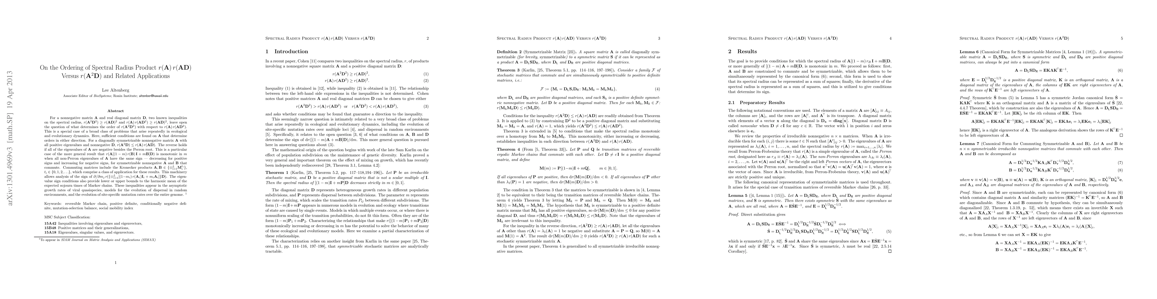 For a nonnegative matrix A and real diagonal matrix D, two known inequalities on the spectral radius, r(A^2 D^2) >= r(AD)^2 and r(A) r(A D^2) >= r(AD)^2, leave open the question of what determines the order of r(A^2 D^2) with respect to r(A) r(A D^2). This is a special case of a broad class of problems that arise repeatedly in ecological and evolutionary dynamics. Here, sufficient conditions are found on A that determine orders in either direction. For a diagonally symmetrizable nonnegative matrix A with all positive eigenvalues and nonnegative D, r(A^2 D) <= r(A) r(AD). The reverse holds if all of the eigenvalues of A are negative besides the Perron root. This is a particular case of the more general result that r(A [(1-m) r(B) I + m B] D) is monotonic in m when all non-Perron eigenvalues of A have the same sign --- decreasing for positive signs and increasing for negative signs, for symmetrizable nonnegative A and B that commute. Commuting matrices include the Kronecker products A, B in {\otimes_{i=1}^L M_i^{t_i}}, t_i in {0, 1, 2, ...}, which comprise a class of application for these results. This machinery allows analysis of the sign of d/d m_j r({\otimes_{i=1}^L[(1-m_i) r(A_i) I_i + m_i A_i]}D). The eigenvalue sign conditions also provide lower or upper bounds to the harmonic mean of the expected sojourn times of Markov chains. These inequalities appear in the asymptotic growth rates of viral quasispecies, models for the evolution of dispersal in random environments, and the evolution of site-specific mutation rates over the entire genome.