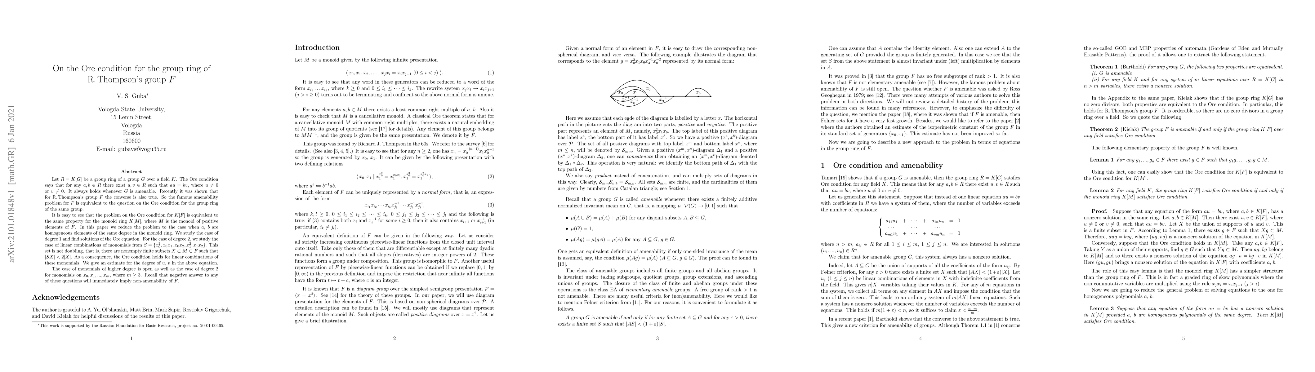 Let $R=K[G]$ be a group ring of a group $G$ over a field $K$. The Ore condition says that for any $a,b\in R$ there exist $u,v\in R$ such that $au=bv$, where $u\ne0$ or $v\ne0$. It always holds whenever $G$ is amenable. Recently it was shown that for R.\,Thompson's group $F$ the converse is also true. So the famous amenability problem for $F$ is equivalent to the question on the Ore condition for the group ring of the same group. It is easy to see that the problem on the Ore condition for $K[F]$ is equivalent to the same property for the monoid ring $K[M]$, where $M$ is the monoid of positive elements of $F$. In this paper we reduce the problem to the case when $a$, $b$ are homogeneous elements of the same degree in the monoid ring. We study the case of degree $1$ and find solutions of the Ore equation. For the case of degree $2$, we study the case of linear combinations of monomials from $S=\{x_0^2,x_0x_1,x_0x_2,x_1^2,x_1x_2\}$. This set is not doubling, that is, there are nonempty finite subsets $X\subset M\subset F$ such that $|SX| < 2|X|$. As a consequence, the Ore condition holds for linear combinations of these monomials. We give an estimate for the degree of $u$, $v$ in the above equation. The case of monomials of higher degree is open as well as the case of degree $2$ for monomials on $x_0,x_1,...,x_m$, where $m\ge3$. Recall that negative answer to any of these questions will immediately imply non-amenability of $F$.