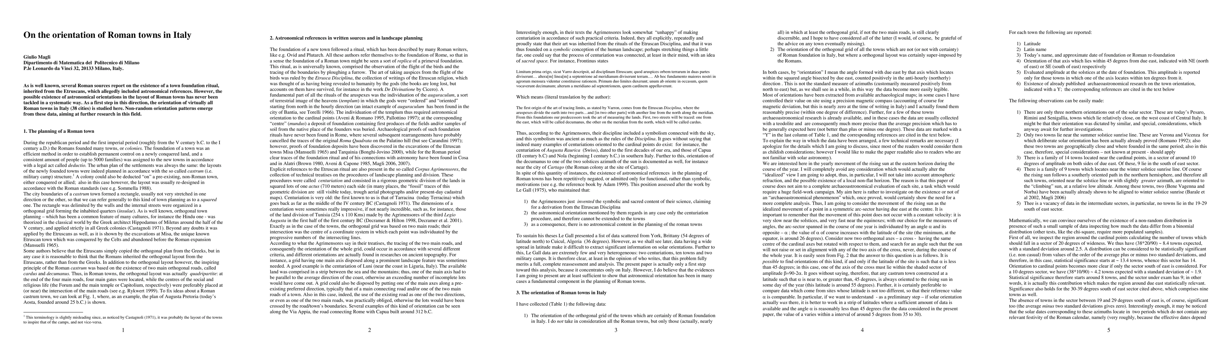 As is well known, several Roman sources report on the existence of a town foundation ritual, inherited from the Etruscans, which allegedly included astronomical references. However, the possible existence of astronomical orientations in the layout of Roman towns has never been tackled in a systematic way. As a first step in this direction, the orientation of virtually all Roman towns in Italy (38 cities) is studied here. Non-random orientation patterns emerge from these data, aiming at further research in this field.