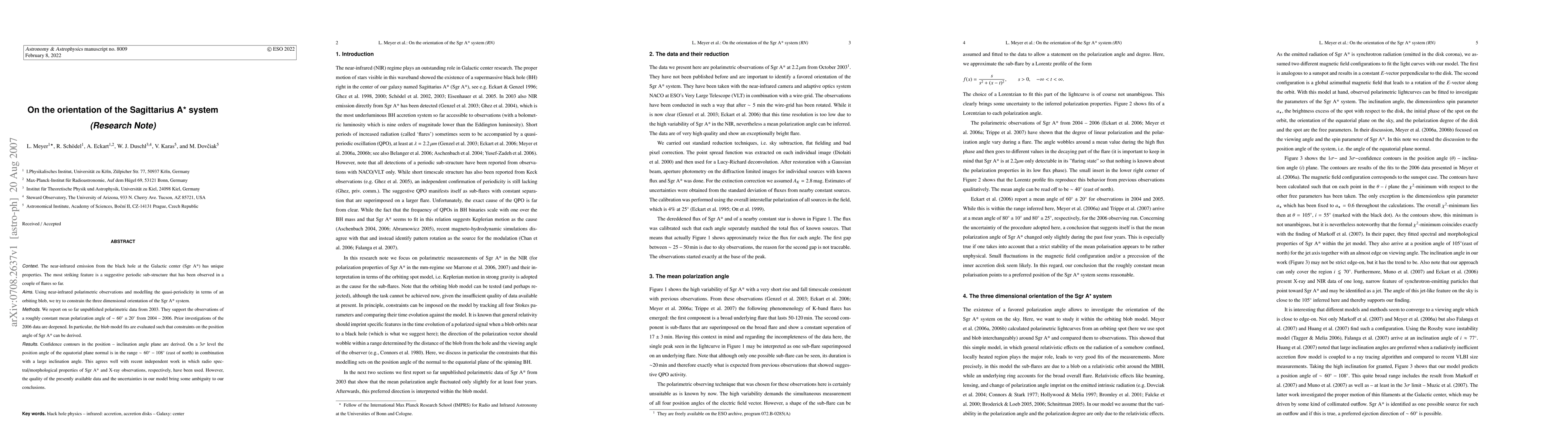 The near-infrared emission from the black hole at the Galactic center (Sgr A*) has unique properties. The most striking feature is a suggestive periodic sub-structure that has been observed in a couple of flares so far. Using near-infrared polarimetric observations and modelling the quasi-periodicity in terms of an orbiting blob, we try to constrain the three dimensional orientation of the Sgr A* system. We report on so far unpublished polarimetric data from 2003. They support the observations of a roughly constant mean polarization angle of 60 degr \pm 20 degr from 2004-2006. Prior investigations of the 2006 data are deepened. In particular, the blob model fits are evaluated such that constraints on the position angle of Sgr A* can be derived. Confidence contours in the position-inclination angle plane are derived. On a 3sigma level the position angle of the equatorial plane normal is in the range 60 degr - 108 degr (east of north) in combination with a large inclination angle. This agrees well with recent independent work in which radio spectral/morphological properties of Sgr A* and X-ray observations, respectively, have been used. However, the quality of the presently available data and the uncertainties in our model bring some ambiguity to our conclusions.