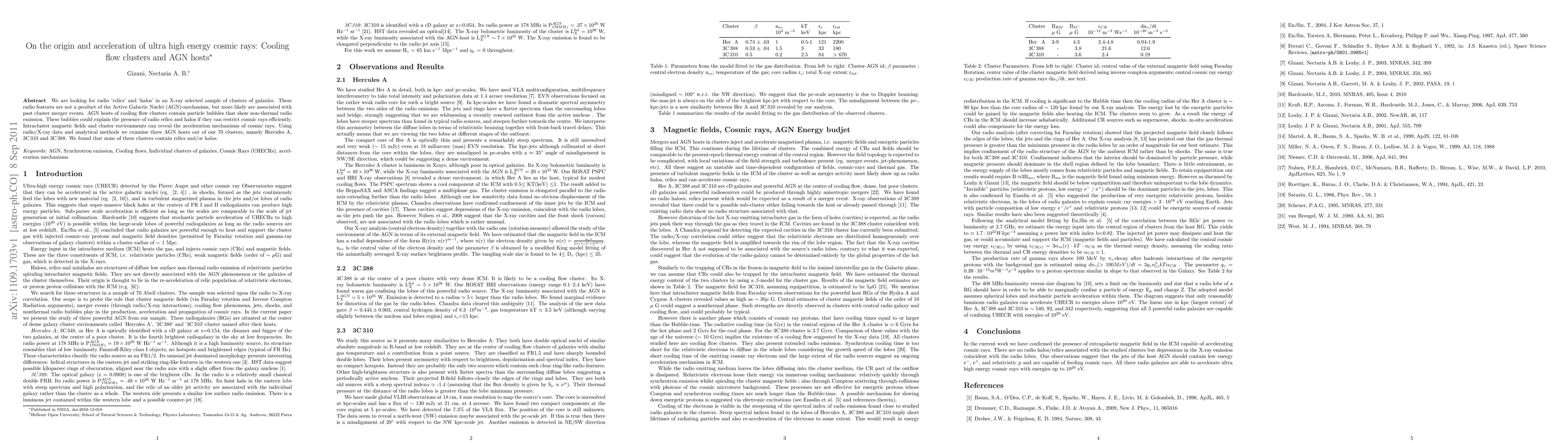 This paper investigates the origins and acceleration mechanisms of cosmic rays in cooling flow clusters and AGN hosts, focusing on radio relics and halos. The study finds no evidence of these features in three selected AGN hosts, suggesting that cosmic rays may be linked to past merger events rather than AGN activity.