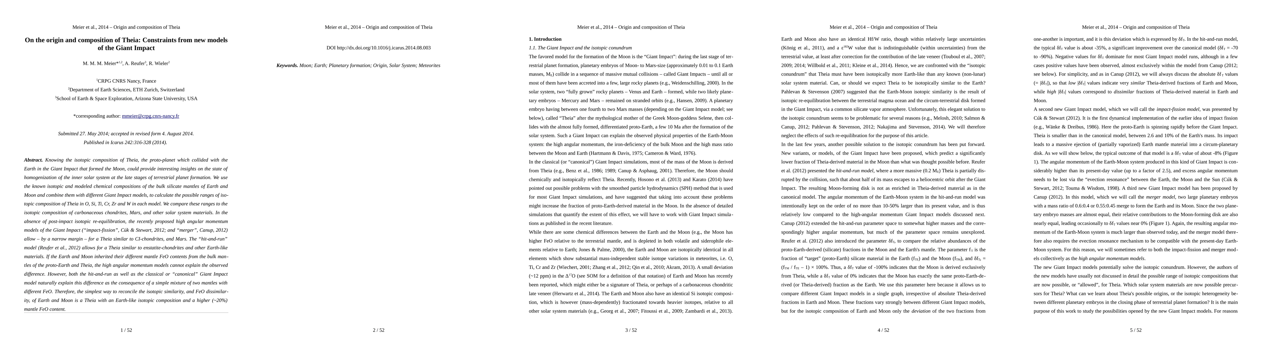 This research explores the composition of Theia, the proto-planet that collided with Earth to form the Moon. By analyzing isotopic compositions of elements like O, Si, Ti, Cr, Zr, and W in various Giant Impact models, the study concludes that Theia likely had an Earth-like isotopic composition with a higher (~20%) mantle FeO content to explain the observed differences between Earth and Moon.