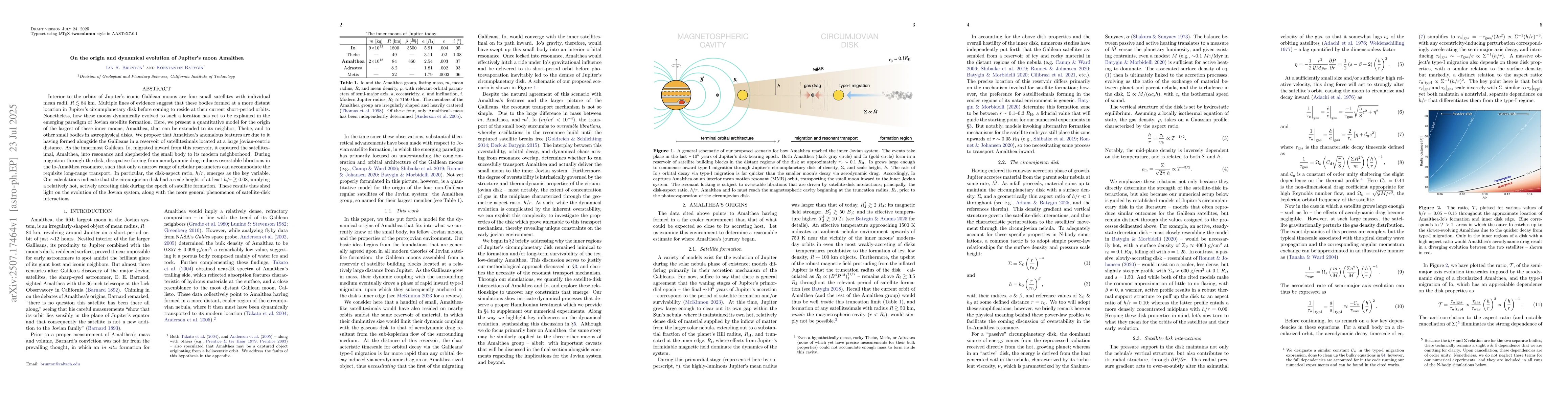 Interior to the orbits of Jupiter's iconic Galilean moons are four small satellites with individual mean radii, $R\lesssim 84$ km. Multiple lines of evidence suggest that these bodies formed at a more distant location in Jupiter's circumplanetary disk before coming to reside at their current short-period orbits. Nonetheless, how these moons dynamically evolved to such a location has yet to be explained in the emerging paradigm of Jovian satellite formation. Here, we present a quantitative model for the origin of the largest of these inner moons, Amalthea, that can be extended to its neighbor, Thebe, and to other small bodies in astrophysical disks. We propose that Amalthea's anomalous features are due to it having formed alongside the Galileans in a reservoir of satellitesimals located at a large jovian-centric distance. As the innermost Galilean, Io, migrated inward from this reservoir, it captured the satellitesimal, Amalthea, into resonance and shepherded the small body to its modern neighborhood. During migration through the disk, dissipative forcing from aerodynamic drag induces overstable librations in the Io-Amalthea resonance, such that only a narrow range of nebular parameters can accommodate the requisite long-range transport. In particular, the disk-aspect ratio, $h/r$, emerges as the key variable. Our calculations indicate that the circumjovian disk had a scale height of at least $h/r\gtrsim0.08$, implying a relatively hot, actively accreting disk during the epoch of satellite formation. These results thus shed light on the evolution of the Jovian system, along with the more general phenomenon of satellite-disk interactions.