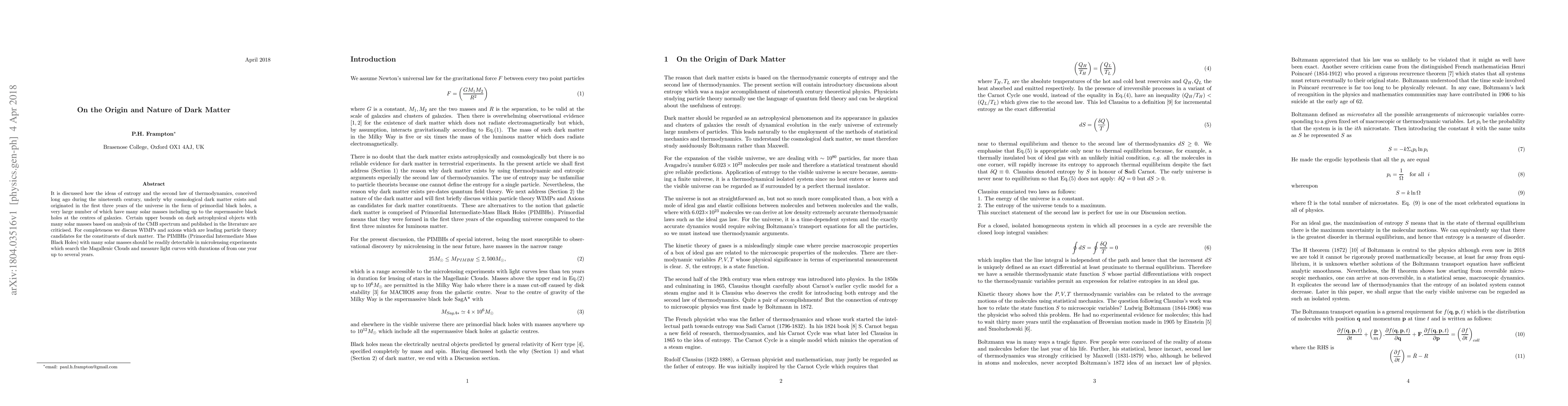 It is discussed how the ideas of entropy and the second law of thermodynamics, conceived long ago during the nineteenth century, underly why cosmological dark matter exists and originated in the first three years of the universe in the form of primordial black holes, a very large number of which have many solar masses including up to the supermassive black holes at the centres of galaxies. Certain upper bounds on dark astrophysical objects with many solar masses based on analysis of the CMB spectrum and published in the literature are criticised. For completeness we discuss WIMPs and axions which are leading particle theory candidates for the constituents of dark matter. The PIMBHs (Primordial Intermediate Mass Black Holes) with many solar masses should be readily detectable in microlensing experiments which search the Magallenic Clouds and measure light curves with durations of from one year up to several years.