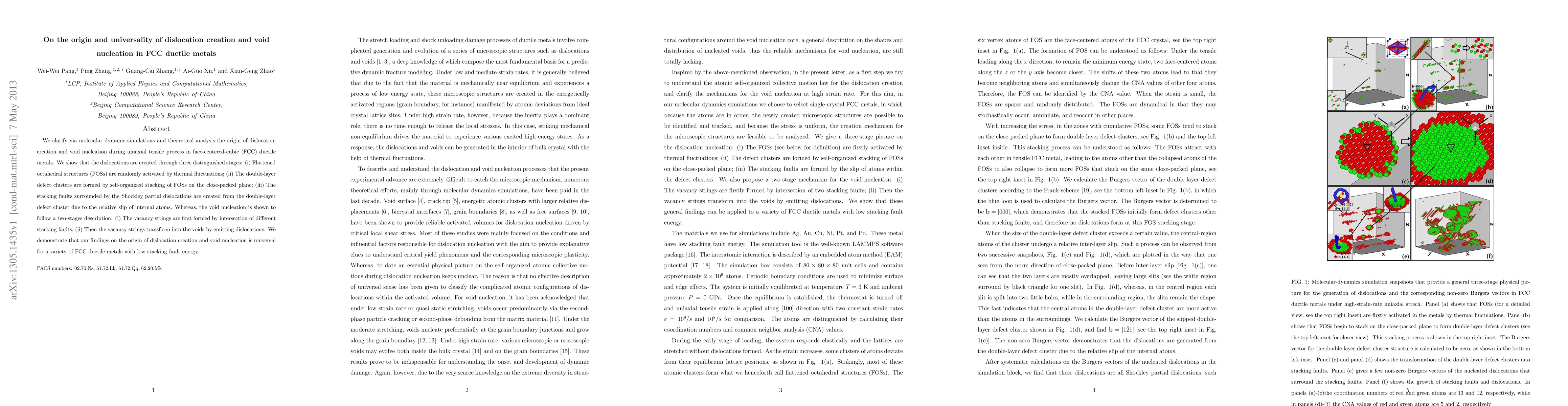 The paper presents a comprehensive molecular dynamics simulation study elucidating the universal origin of dislocation creation and void nucleation in FCC ductile metals, providing detailed descriptions of the three-stage dislocation creation process and two-stage void nucleation process.