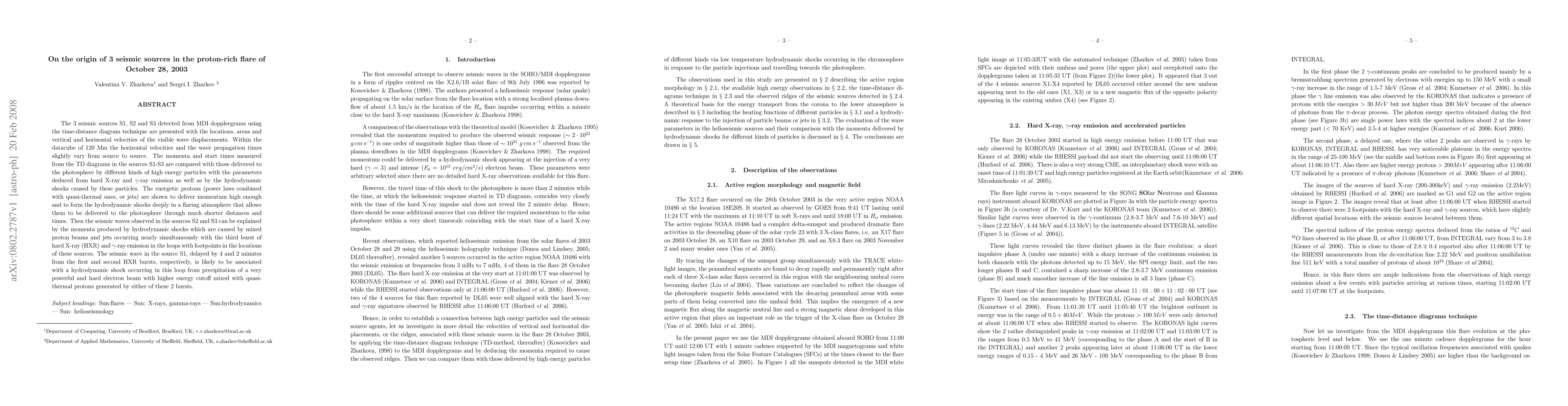 The 3 seismic sources S1, S2 and S3 detected from MDI dopplergrams using the time-distance diagram technique are presented with the locations, areas and vertical and horizontal velocities of the visible wave displacements. Within the datacube of 120 Mm the horizontal velocities and the wave propagation times slightly vary from source to source. The momenta and start times measured from the TD diagrams in the sources S1-S3 are compared with those delivered to the photosphere by different kinds of high energy particles with the parameters deduced from hard X-ray and $\gamma$-ray emission as well as by the hydrodynamic shocks caused by these particles. The energetic protons (power laws combined with quasi-thermal ones, or jets) are shown to deliver momentum high enough and to form the hydrodynamic shocks deeply in a flaring atmosphere that allows them to be delivered to the photosphere through much shorter distances and times. Then the seismic waves observed in the sources S2 and S3 can be explained by the momenta produced by hydrodynamic shocks which are caused by mixed proton beams and jets occurring nearly simultaneously with the third burst of hard X-ray (HXR) and $\gamma$-ray emission in the loops with footpoints in the locations of these sources. The seismic wave in the source S1, delayed by 4 and 2 minutes from the first and second HXR bursts, respectively, is likely to be associated with a hydrodynamic shock occurring in this loop from precipitation of a very powerful and hard electron beam with higher energy cutoff mixed with quasi-thermal protons generated by either of these 2 bursts.