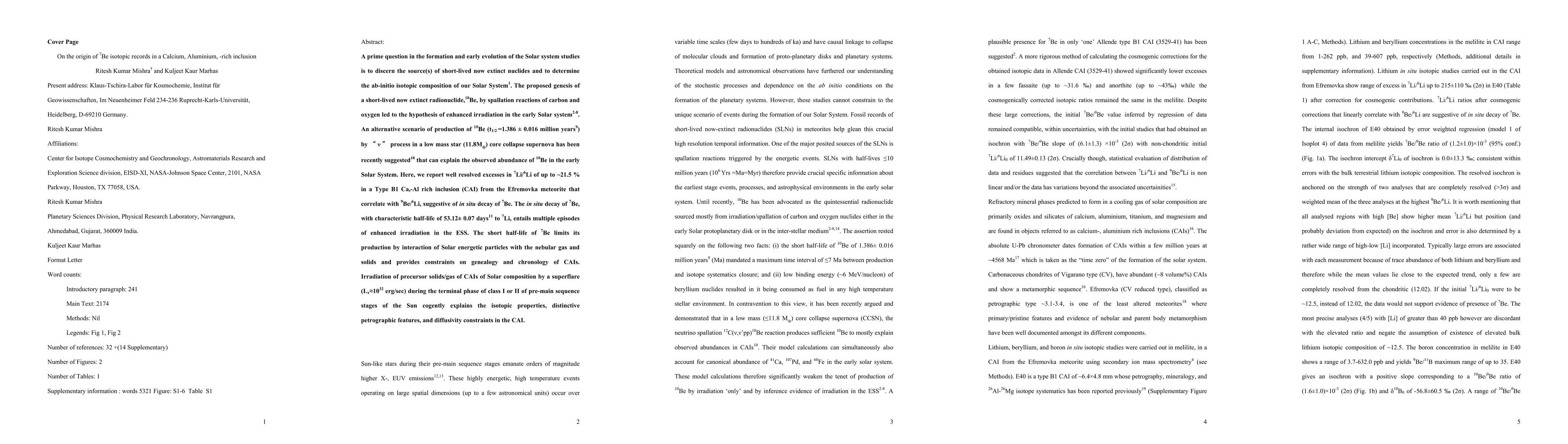 A prime question in the formation and early evolution of the Solar system studies is to discern the source(s) of short-lived now extinct nuclides and to determine the ab-initio isotopic composition of our Solar System (ref. 1). The proposed genesis of a short-lived now extinct radionuclide,10Be, by spallation reactions of carbon and oxygen led to the hypothesis of enhanced irradiation in the early Solar system (ref. 2-8). An alternative scenario of production of 10Be (t1/2 =1.386 +- 0.016 million years (ref.9)) by neutrino process in a low mass star (11.8Msun) core collapse supernova has been recently suggested (ref. 10) that can explain the observed abundance of 10Be in the early Solar System. Here, we report well resolved excesses in 7Li/6Li of up to ~21.5 percent in a Type B1 Ca,-Al rich inclusion (CAI) from the Efremovka meteorite that correlate with 9Be/6Li, suggestive of in situ decay of 7Be. The in situ decay of 7Be, with characteristic half-life of 53.12+- 0.07 days (ref. 11) to 7Li, entails multiple episodes of enhanced irradiation in the ESS. The short half-life of 7Be limits its production by interaction of Solar energetic particles with the nebular gas and solids and provides constraints on genealogy and chronology of CAIs. Irradiation of precursor solids/gas of CAIs of Solar composition by a superflare (Lx=10 exp(32) erg/sec) during the terminal phase of class I or II of pre-main sequence stages of the Sun cogently explains the isotopic properties, distinctive petrographic features, and diffusivity constraints in the CAI.