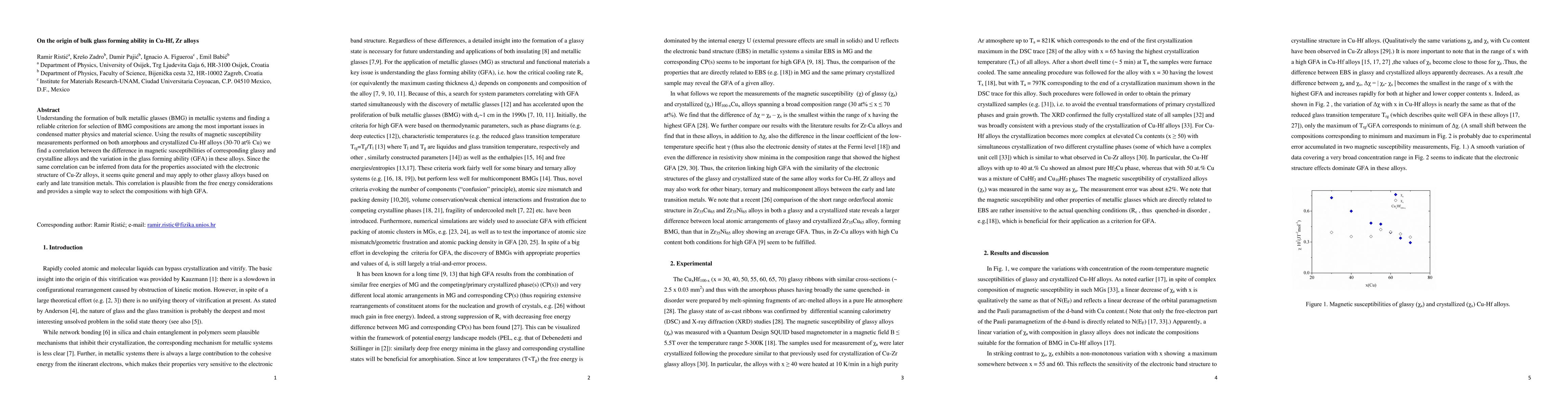 Understanding the formation of bulk metallic glasses (BMG) in metallic systems and finding a reliable criterion for selection of BMG compositions are among the most important issues in condensed matter physics and material science. Using the results of magnetic susceptibility measurements performed on both amorphous and crystallized Cu-Hf alloys (30-70 at% Cu) we find a correlation between the difference in magnetic susceptibilities of corresponding glassy and crystalline alloys and the variation in the glass forming ability (GFA) in these alloys. Since the same correlation can be inferred from data for the properties associated with the electronic structure of Cu-Zr alloys, it seems quite general and may apply to other glassy alloys based on early and late transition metals. This correlation is plausible from the free energy considerations and provides a simple way to select the compositions with high GFA.