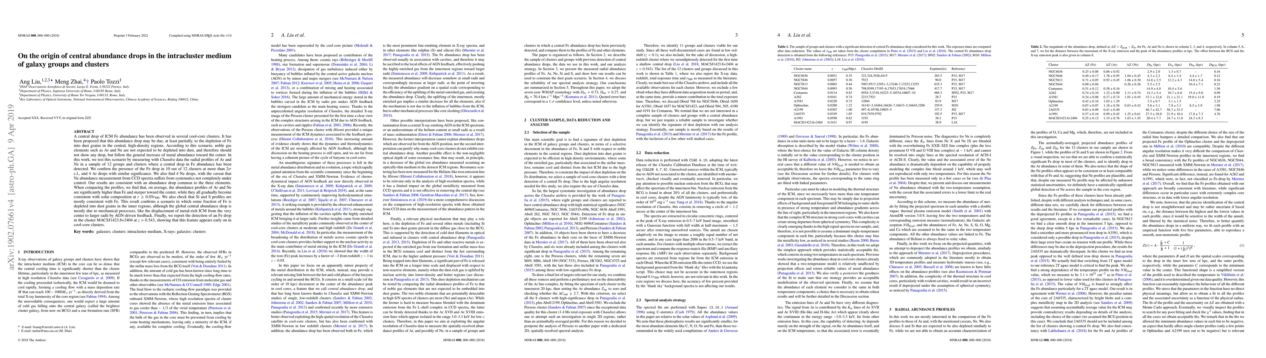A central drop of ICM Fe abundance has been observed in several cool-core clusters. It has been proposed that this abundance drop may be due, at least partially, to the depletion of Fe into dust grains in the central, high-density regions. According to this scenario, noble gas elements such as Ar and Ne are not expected to be depleted into dust, and therefore should not show any drop, but follow the general increase of metal abundance toward the center. In this work, we test this scenario by measuring with {\sl Chandra} data the radial profiles of Ar and Ne in a sample of 12 groups and clusters where a central drop in Fe abundance has been detected. We confirm the presence of the Fe drop in 10 out of 12 clusters at more than 2$\sigma$ c.l., and 4 Ar drops with similar significance. We also find 4 Ne drops, with the caveat that Ne abundance measurement from CCD spectra suffers from systematics not completely under control. Our results are consistent with an abundance drop common to the three elements. When comparing the profiles, we find that, on average, the abundance profiles of Ar and Ne are significantly higher than Fe and steeper toward the center, while they all gradually become consistent with solar composition at $r\geq 0.05r_{500}$. We also check that Si and S profiles are mostly consistent with Fe. This result confirms a scenario in which some fraction of Fe is depleted into dust grains in the inner regions, although the global central abundance drop is mostly due to mechanical processes, like the displacement of metal-rich ICM from the very center to larger radii by AGN-driven feedback. Finally, we report the detection of an Fe drop in the cluster MACSJ1423.8+2404 at $z=0.543$, showing that this feature appears early on in cool-core clusters.