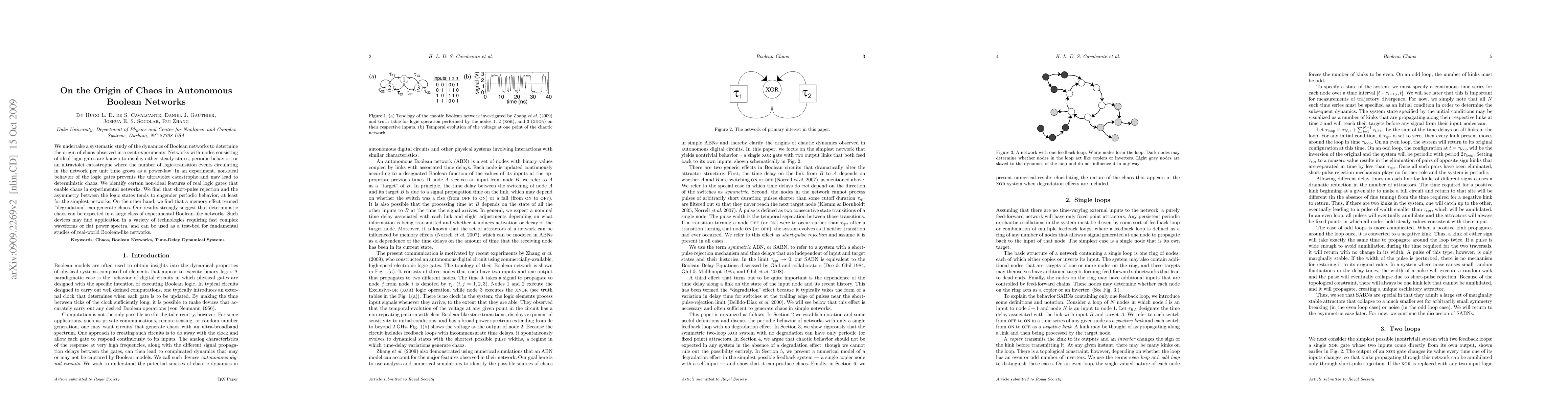 We undertake a systematic study of the dynamics of Boolean networks to determine the origin of chaos observed in recent experiments. Networks with nodes consisting of ideal logic gates are known to display either steady states, periodic behavior, or an ultraviolet catastrophe where the number of logic-transition events circulating in the network per unit time grows as a power-law. In an experiment, non-ideal behavior of the logic gates prevents the ultraviolet catastrophe and may lead to deterministic chaos. We identify certain non-ideal features of real logic gates that enable chaos in experimental networks. We find that short-pulse rejection and the asymmetry between the logic states tends to engender periodic behavior, at least for the simplest networks. On the other hand, we find that a memory effect termed "degradation" can generate chaos. Our results strongly suggest that deterministic chaos can be expected in a large class of experimental Boolean-like networks. Such devices may find application in a variety of technologies requiring fast complex waveforms or flat power spectra, and can be used as a test-bed for fundamental studies of real-world Boolean-like networks.