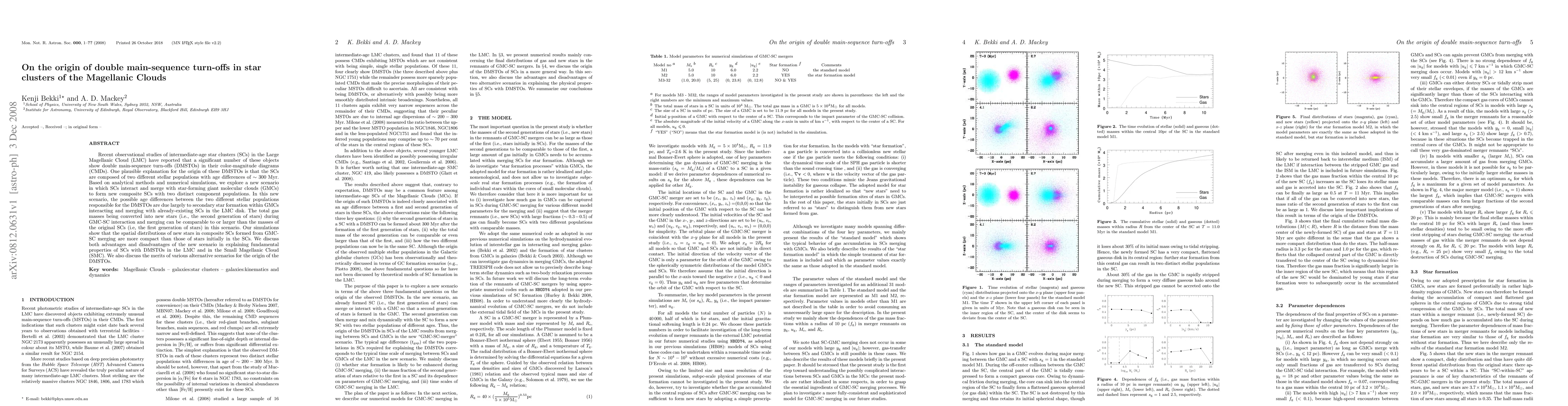 The paper proposes a new scenario for the origin of double main-sequence turn-offs (DMSTOs) in intermediate-age star clusters of the Large Magellanic Cloud. This scenario suggests that star clusters interact and merge with star-forming giant molecular clouds, leading to the formation of composite clusters with two distinct stellar populations. The age differences in these populations are primarily due to secondary star formation within interacting GMCs. The study uses analytical methods and numerical simulations to demonstrate that the spatial distributions of new stars in such composite clusters are more compact than those of the original stars. The advantages, disadvantages, and alternatives to this scenario are also discussed.